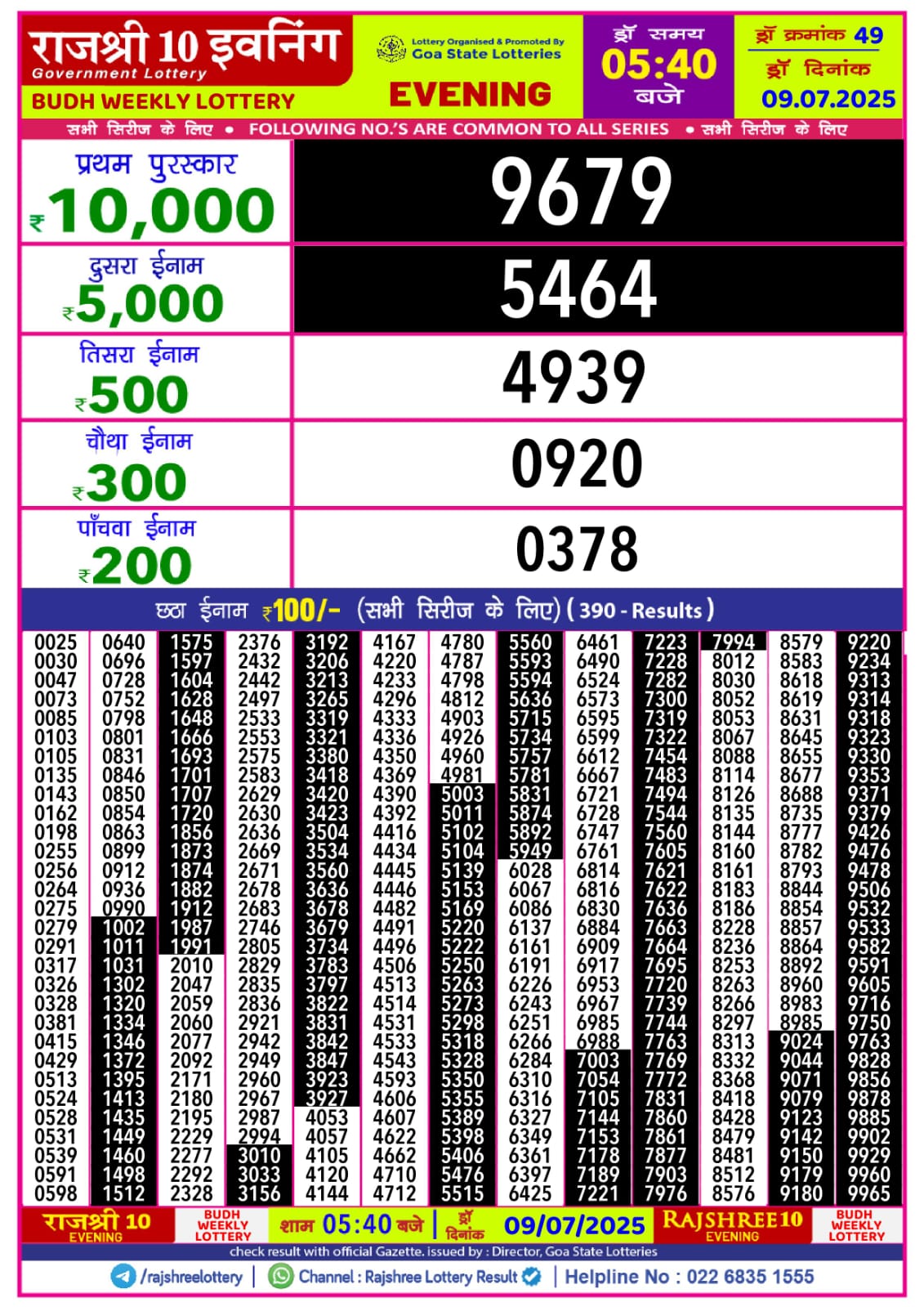 राजश्री 10 लाटरी का का शाम 5.40 बजे का रिज़ल्ट दिनांक 09.7.25