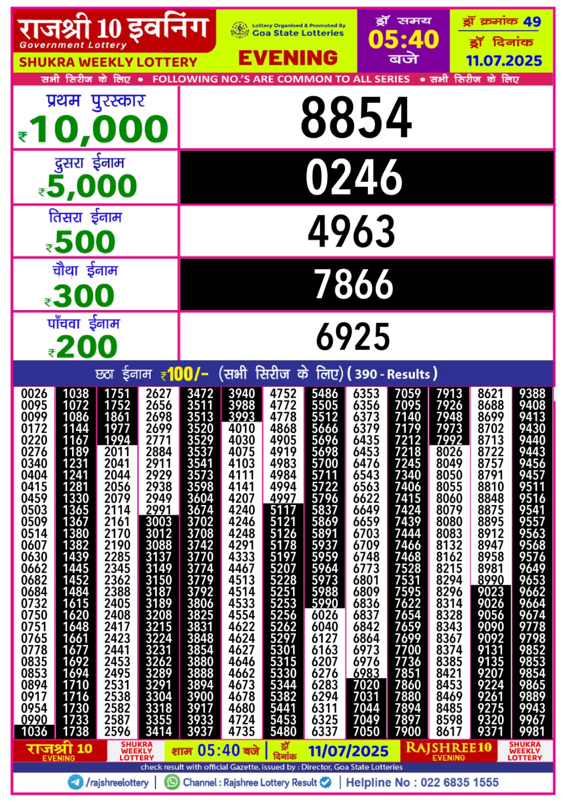 राजश्री 10 लाटरी का का शाम 5.40 बजे का रिज़ल्ट दिनांक 11.7.25