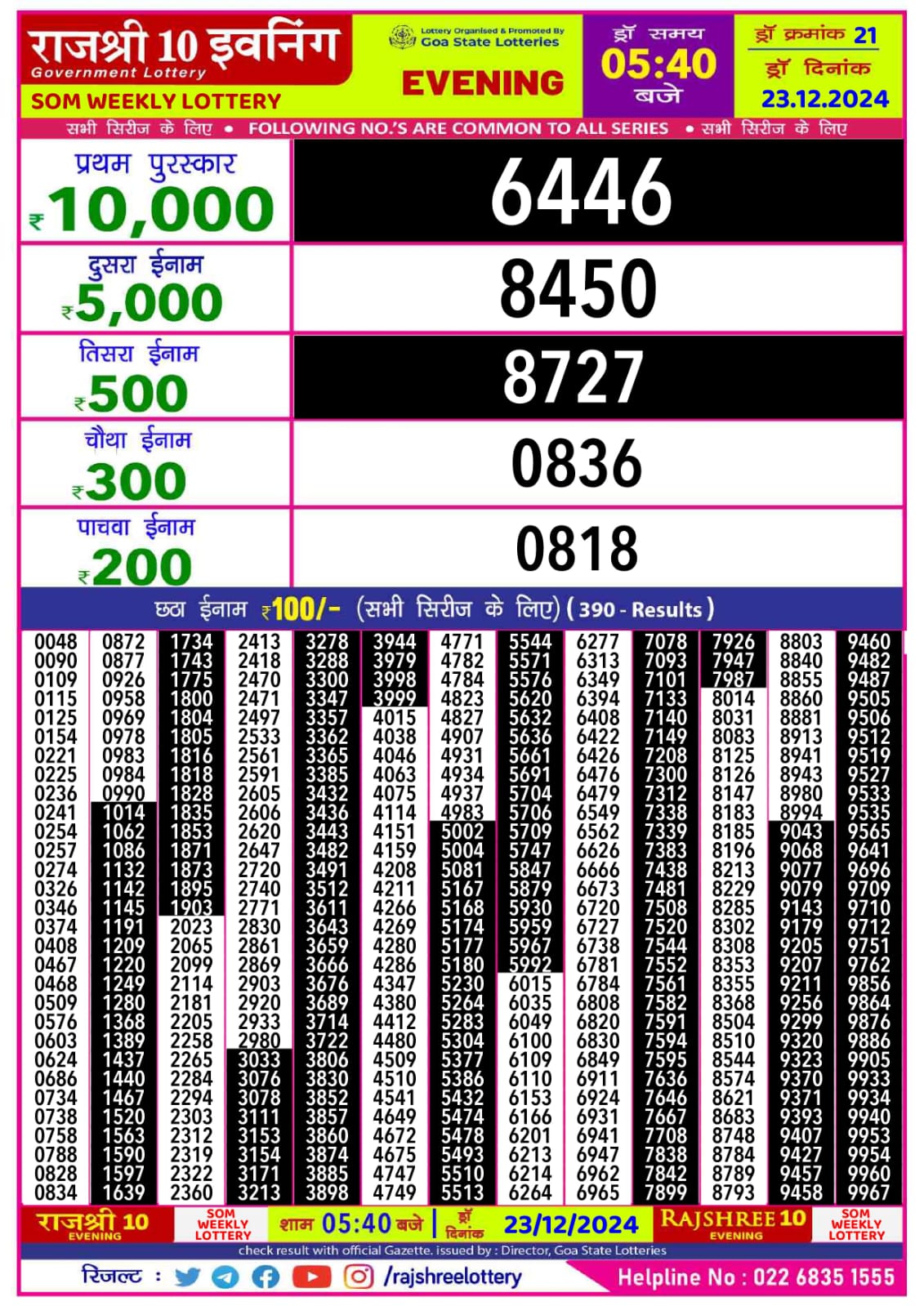 राजश्री 10 लाटरी का का शाम 5.40 बजे का रिज़ल्ट दिनांक 6.8.25