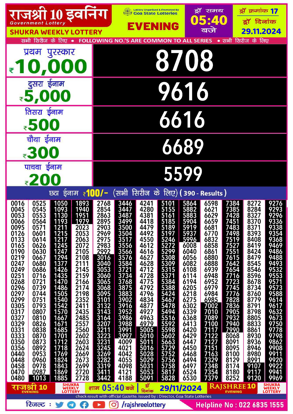 राजश्री 10 लाटरी का का शाम 5.40 बजे का रिज़ल्ट दिनांक 29.7.25