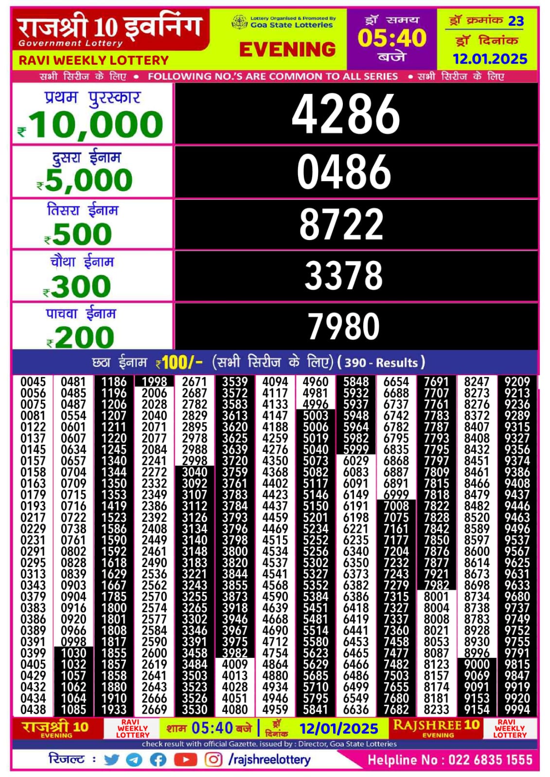 राजश्री 10 लाटरी का का शाम 5.40 बजे का रिज़ल्ट दिनांक 18.8.25