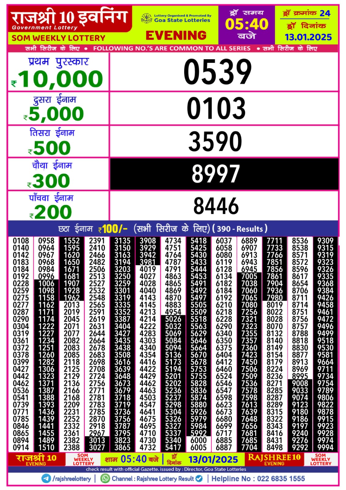 राजश्री 10 लाटरी का का शाम 5.40 बजे का रिज़ल्ट दिनांक 17.8.25