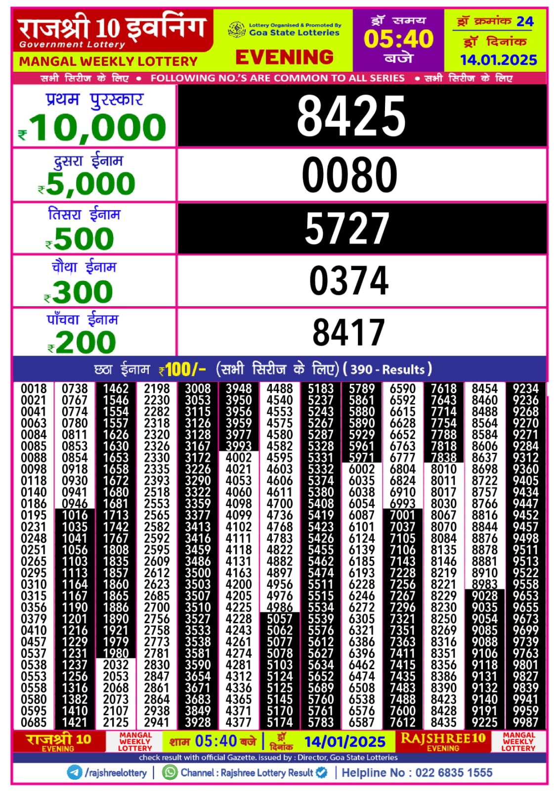राजश्री 10 लाटरी का का शाम 5.40 बजे का रिज़ल्ट दिनांक 16.8.25