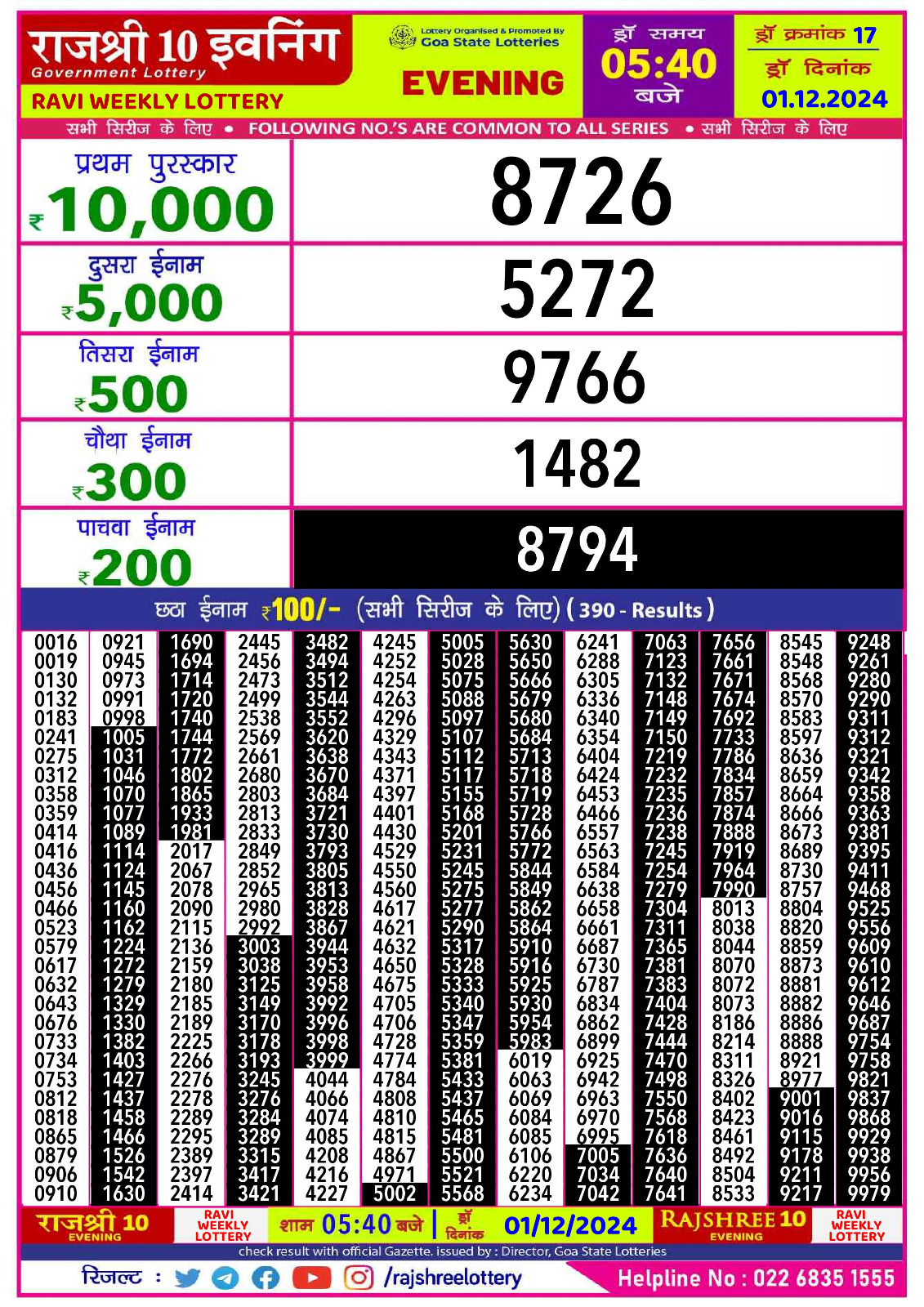 राजश्री 10 लाटरी का का शाम 5.40 बजे का रिज़ल्ट दिनांक 27.7.25