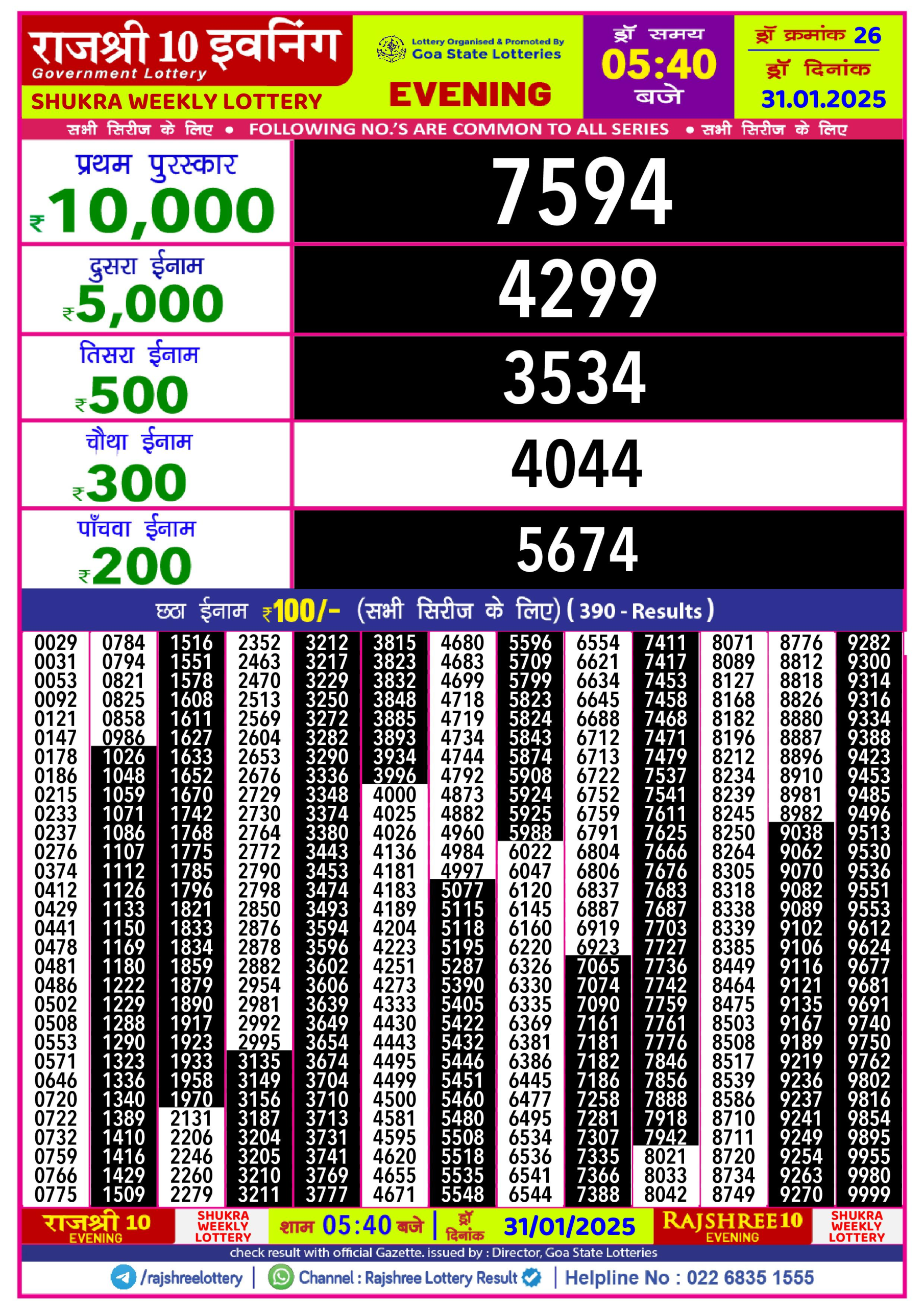 राजश्री 10 लाटरी का का शाम 5.40 बजे का रिज़ल्ट दिनांक 17.9.25