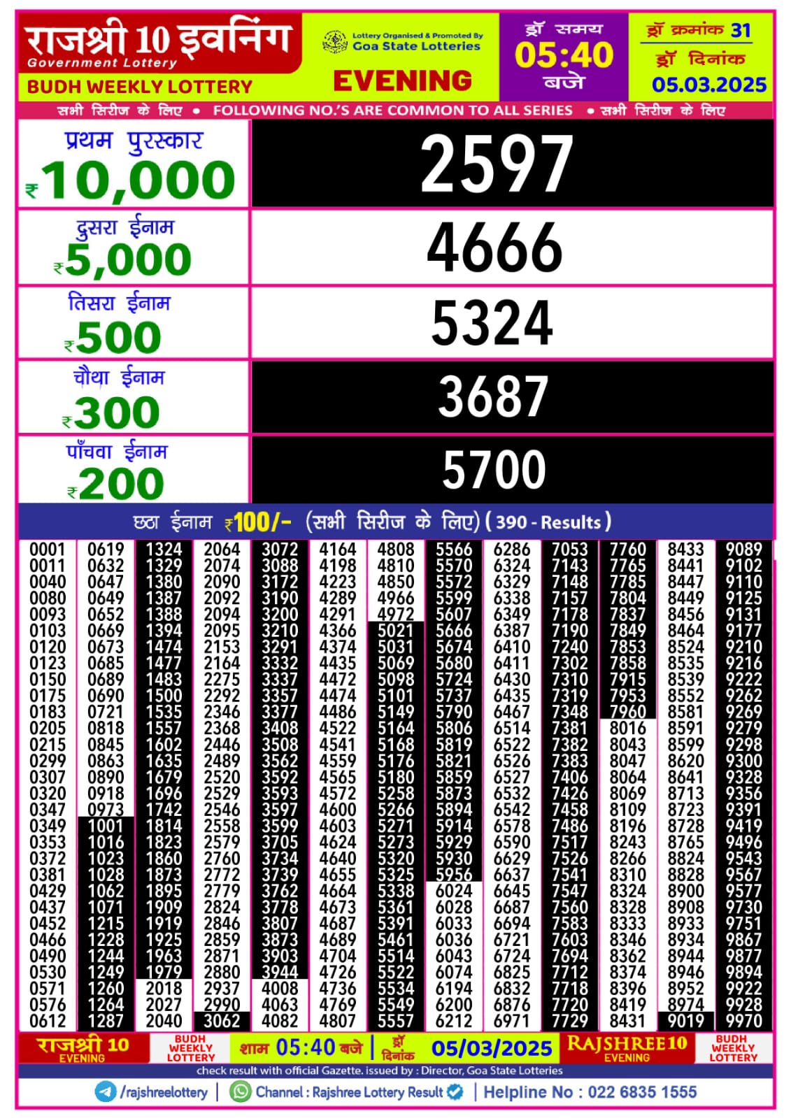 राजश्री 10 लाटरी का का शाम 5.40 बजे का रिज़ल्ट दिनांक 20.10.25