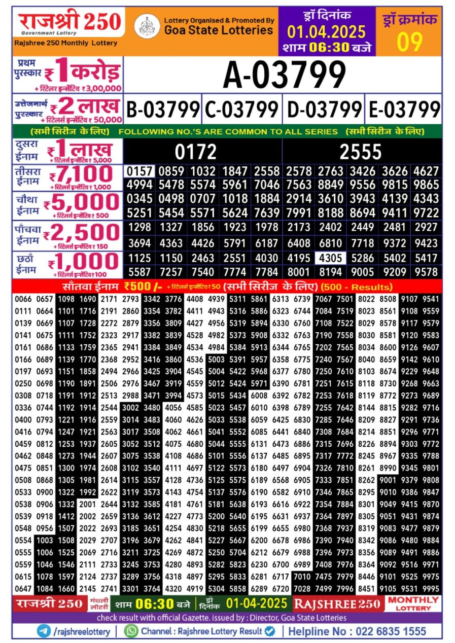 राजश्री 250 मंथली लॉटरी रिजल्ट 02.9.25