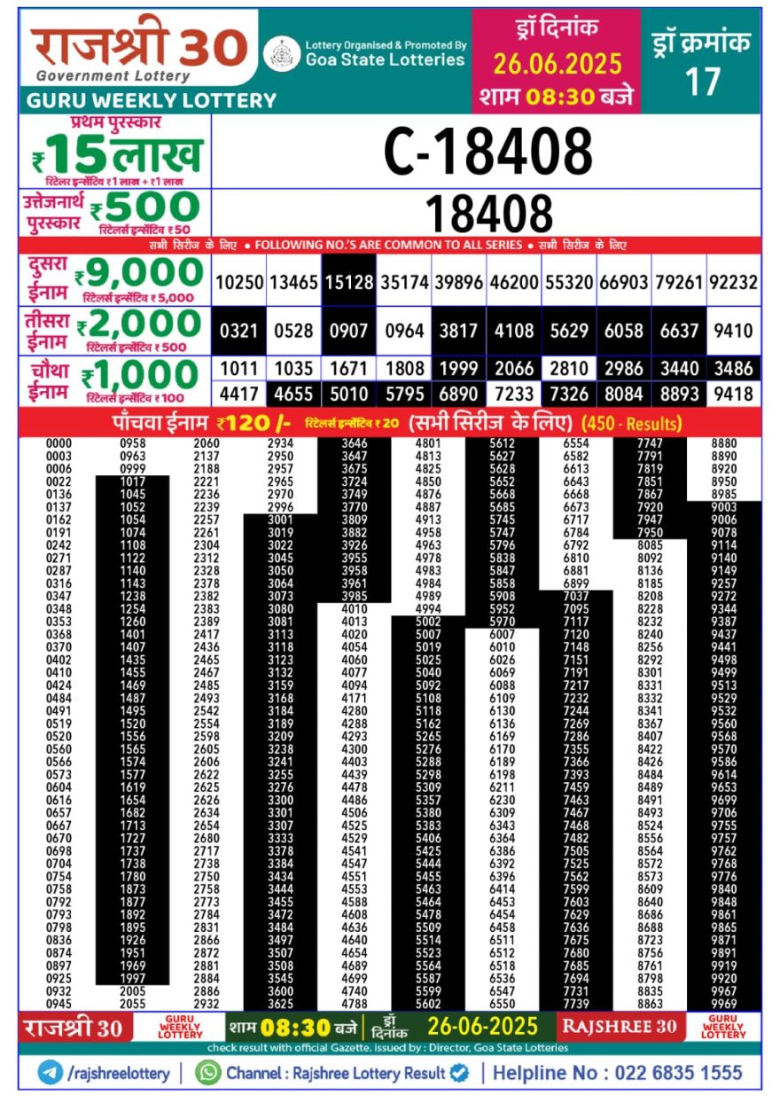 राजश्री 30 लाटरी का रात 8:30 बजे का रिज़ल्ट दिनांक 26.6.25