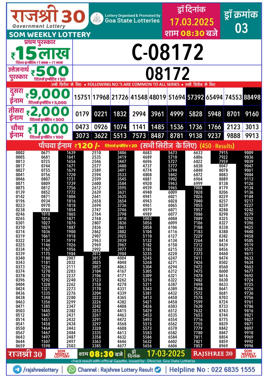 राजश्री 30 लाटरी का रात 8:30 बजे का रिज़ल्ट दिनांक 14.8.25