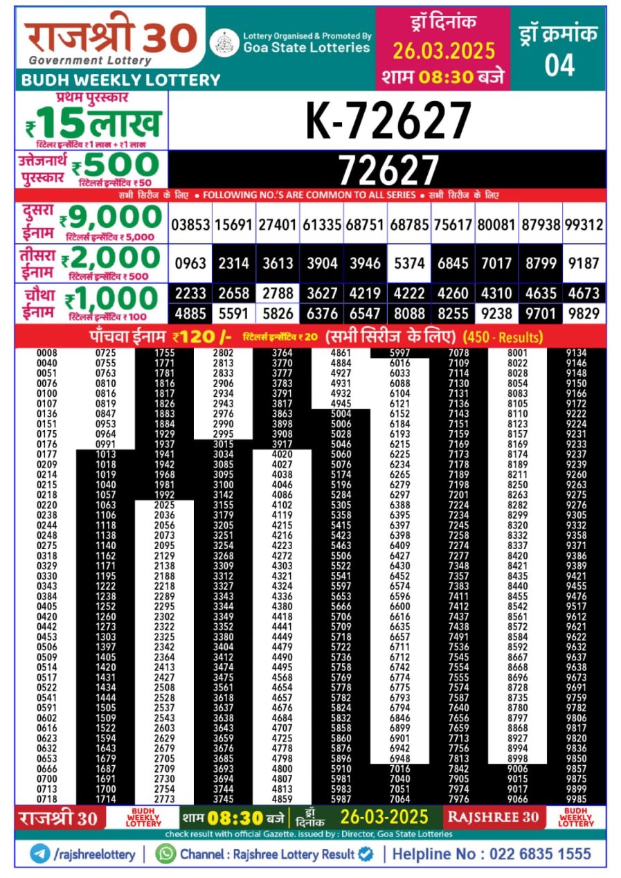 राजश्री 30 लाटरी का रात 8:30 बजे का रिज़ल्ट दिनांक 5.8.25