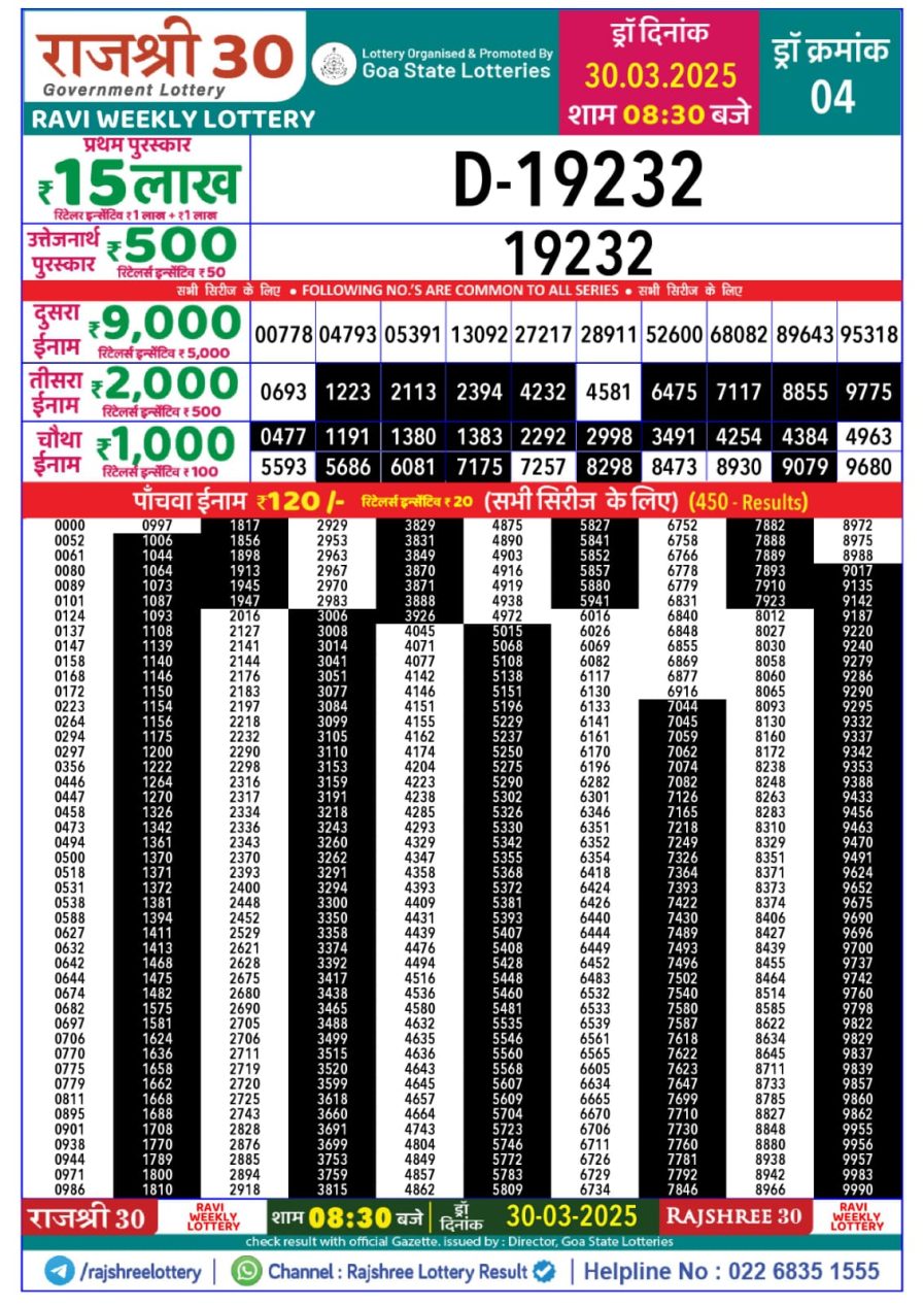 राजश्री 30 लाटरी का रात 8:30 बजे का रिज़ल्ट दिनांक 1.8.25