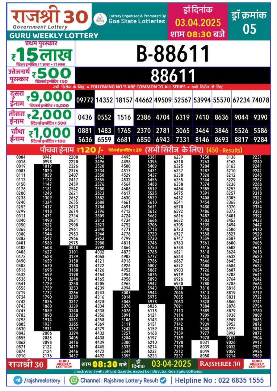 राजश्री 30 लाटरी का रात 8:30 बजे का रिज़ल्ट दिनांक 29.8.25