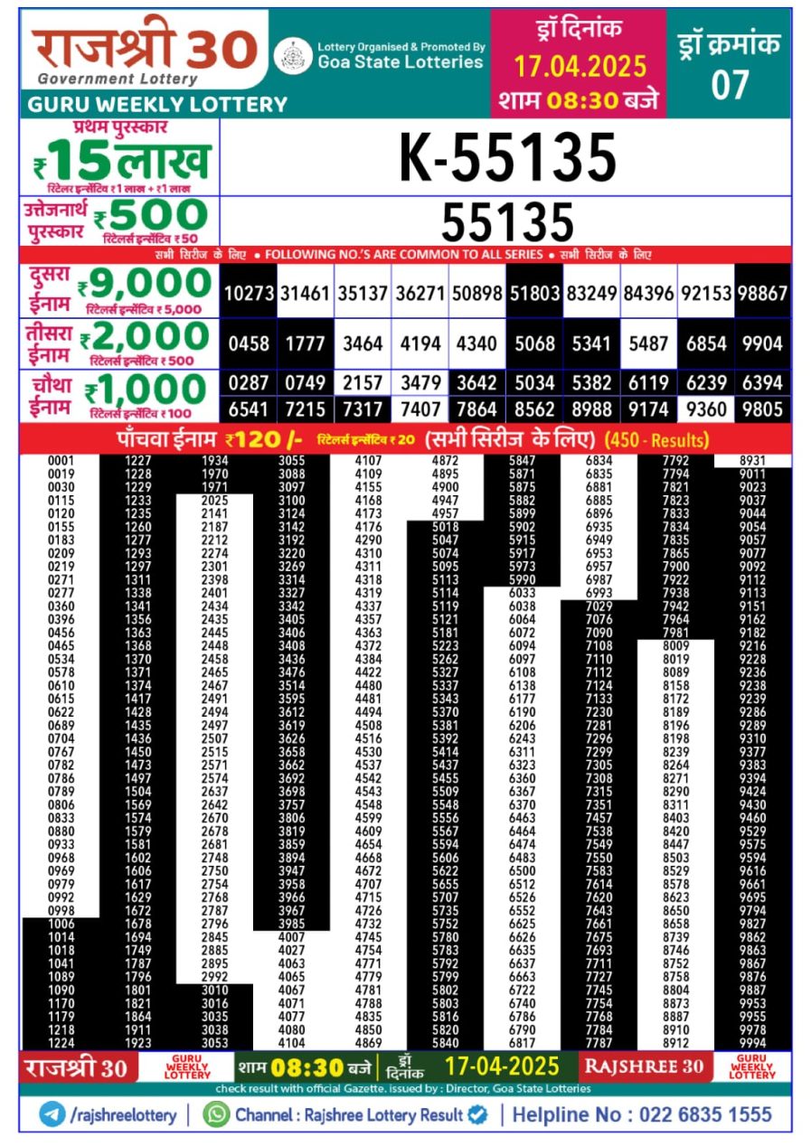 राजश्री 30 लाटरी का रात 8:30 बजे का रिज़ल्ट दिनांक 02.9.25