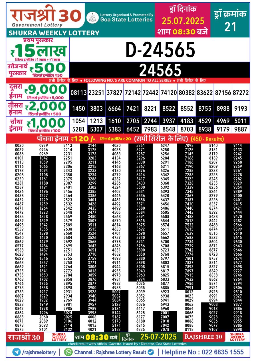 राजश्री 30 लाटरी का रात 8:30 बजे का रिज़ल्ट दिनांक 25.7.25