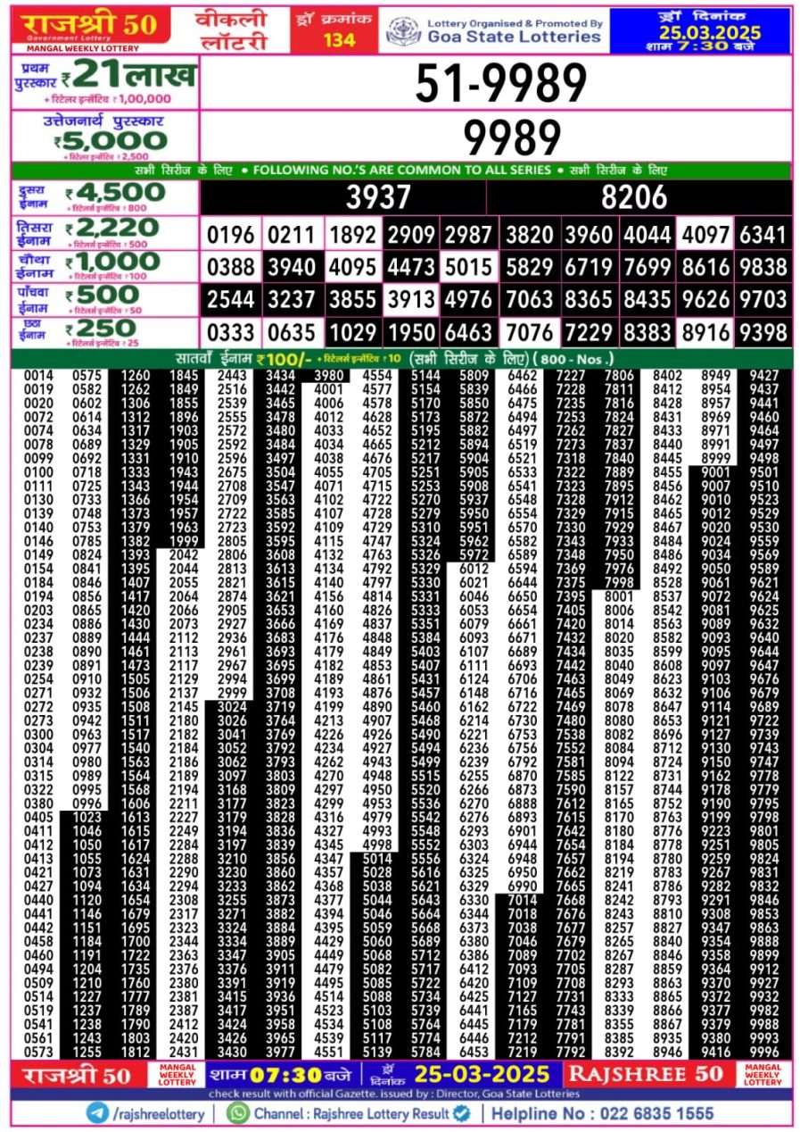 राजश्री 50 लाटरी का रात 7:30 बजे का रिज़ल्ट दिनांक 10.11.25