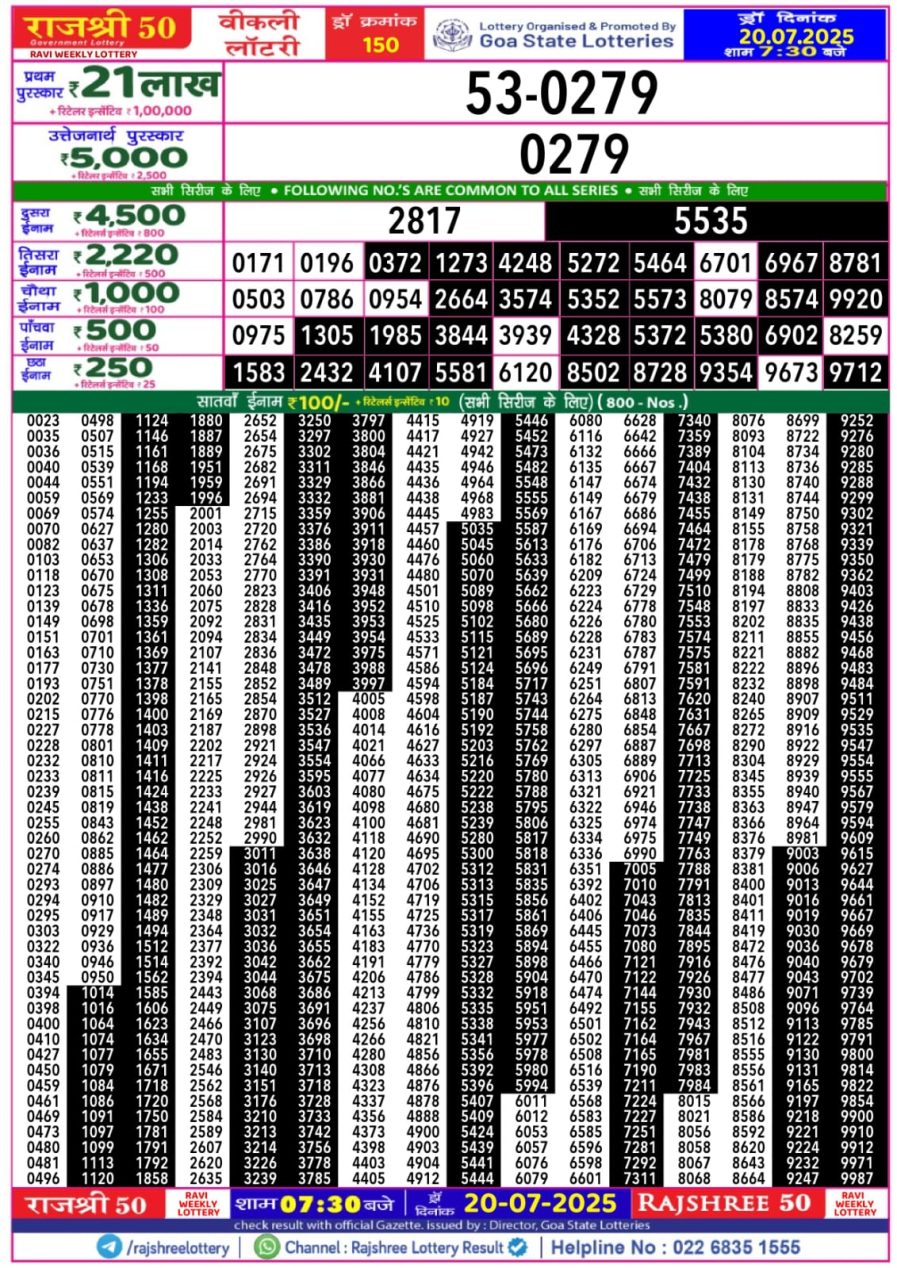 राजश्री 50 लाटरी का रात 7:30 बजे का रिज़ल्ट दिनांक 20.7.25