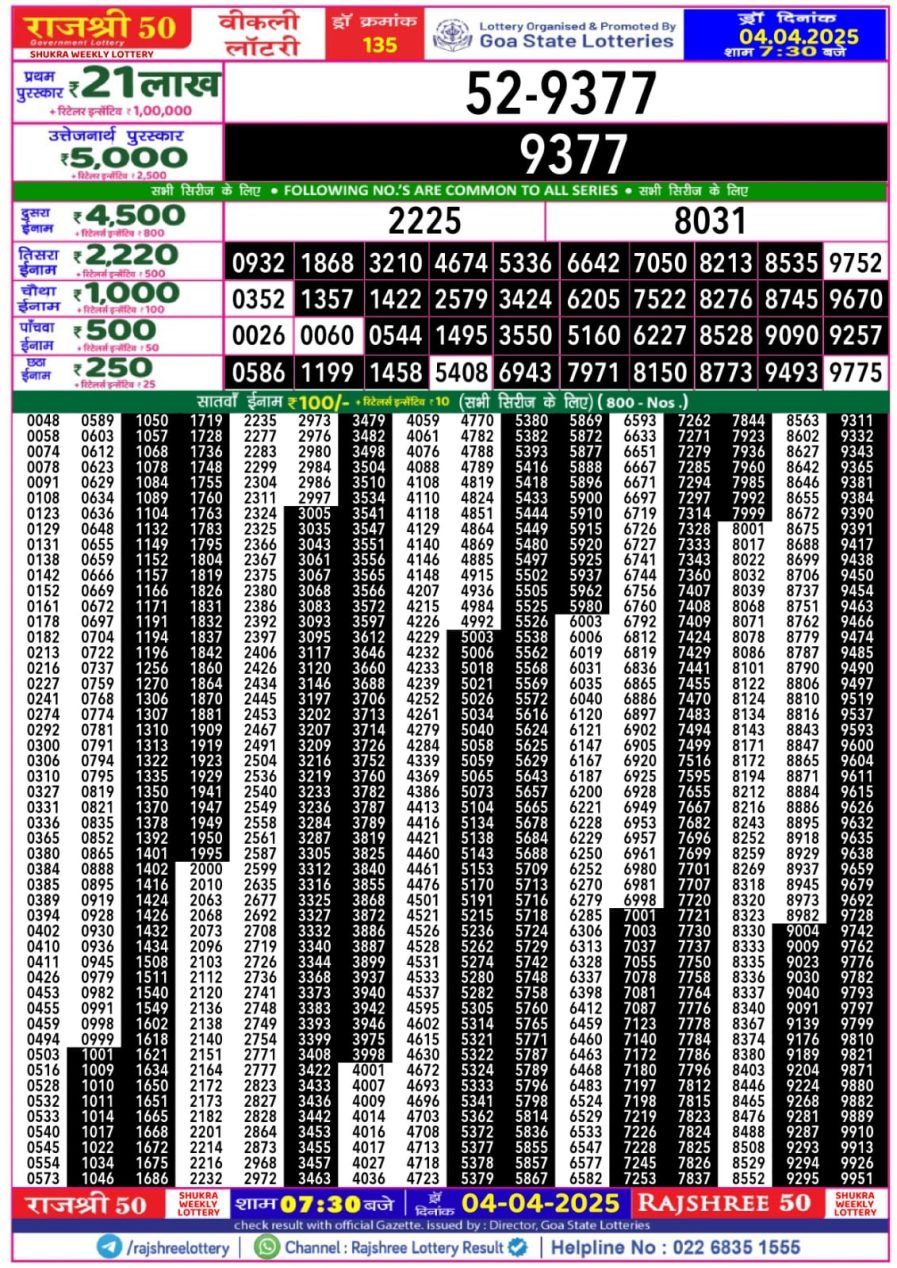 राजश्री 50 लाटरी का रात 7:30 बजे का रिज़ल्ट दिनांक 20.11.25
