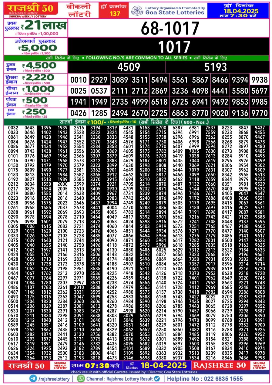 राजश्री 50 लाटरी का रात 7:30 बजे का रिज़ल्ट दिनांक 04.12.25