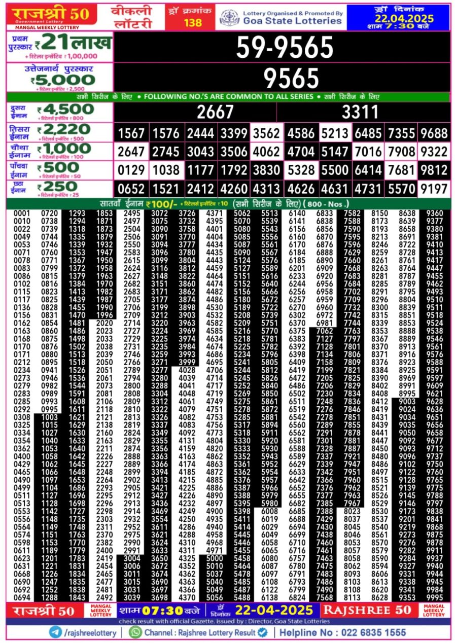 राजश्री 50 लाटरी का रात 7:30 बजे का रिज़ल्ट दिनांक 07.12.25