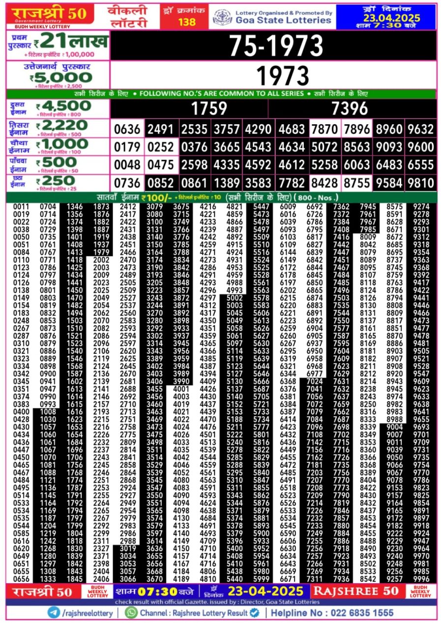 राजश्री 50 लाटरी का रात 7:30 बजे का रिज़ल्ट दिनांक 09.12.25