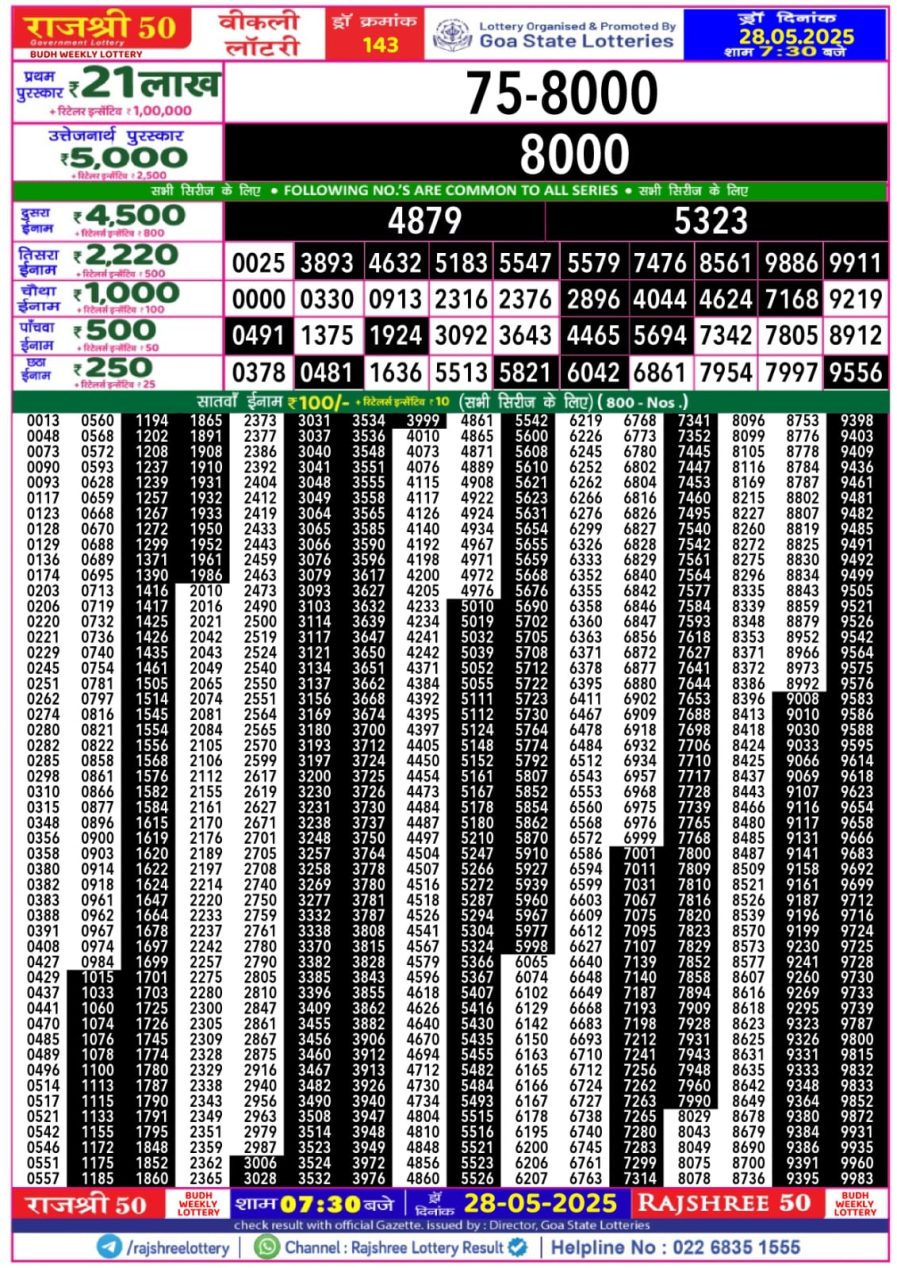 राजश्री 50 लाटरी का रात 7:30 बजे का रिज़ल्ट दिनांक 28.5.25