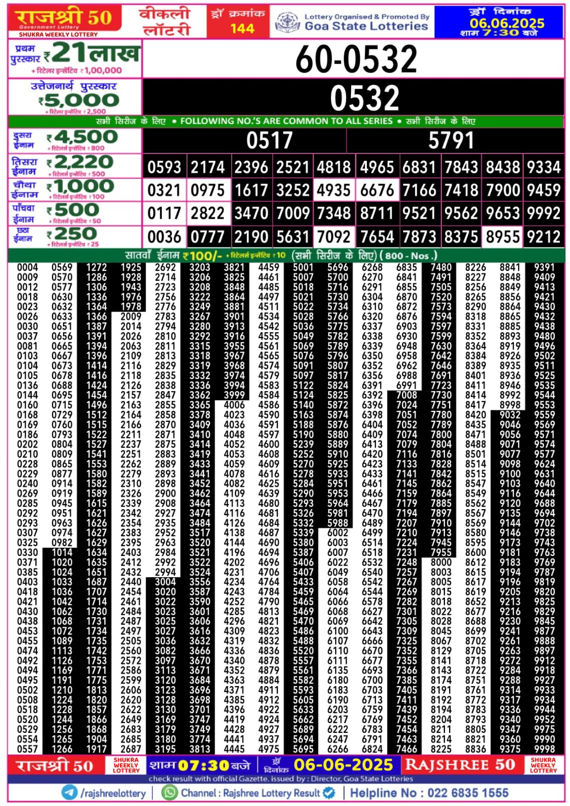 राजश्री 50 लाटरी का रात 7:30 बजे का रिज़ल्ट दिनांक 6.6.25