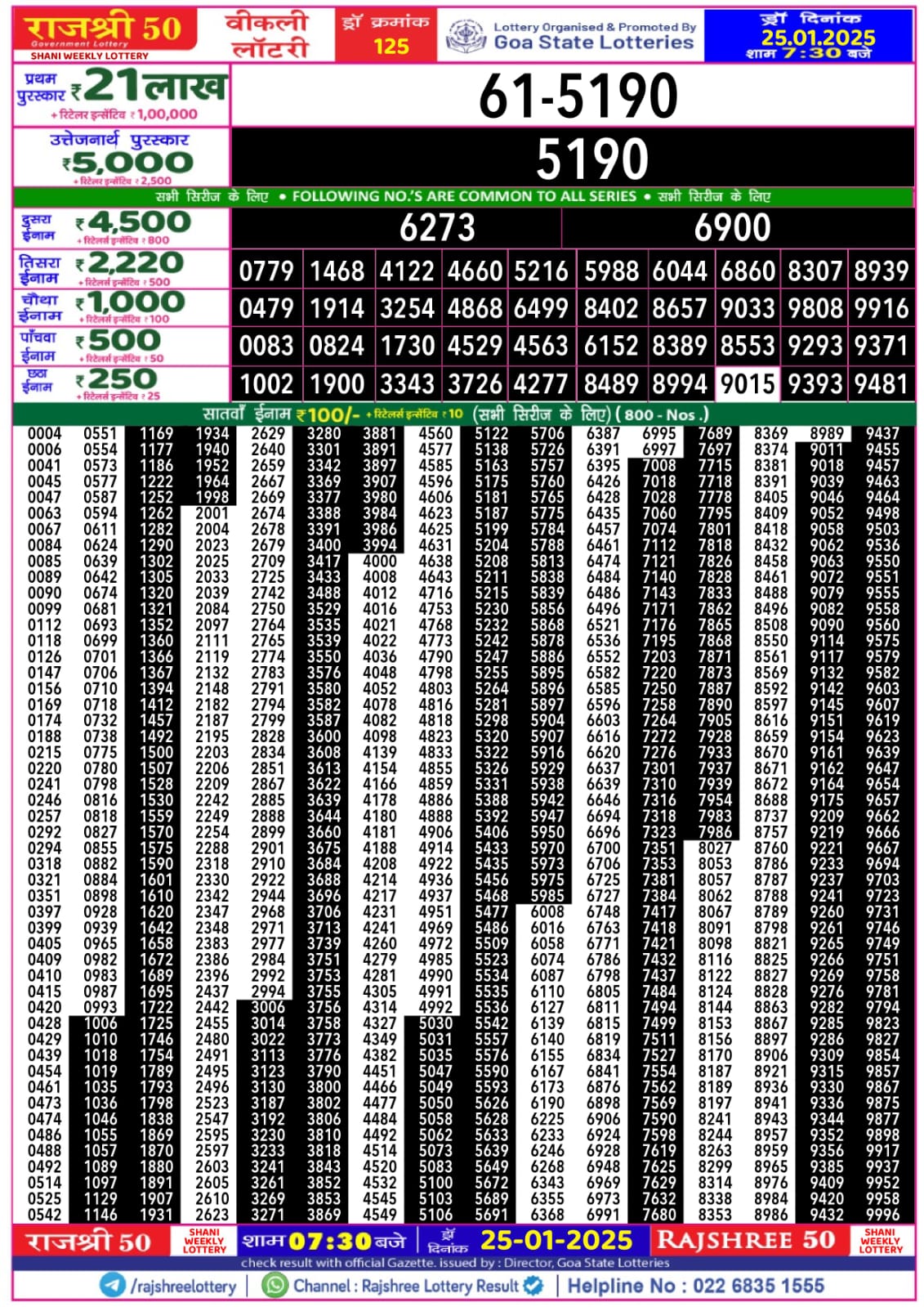 राजश्री 50 लाटरी का रात 7:30 बजे का रिज़ल्ट दिनांक 12.9.25