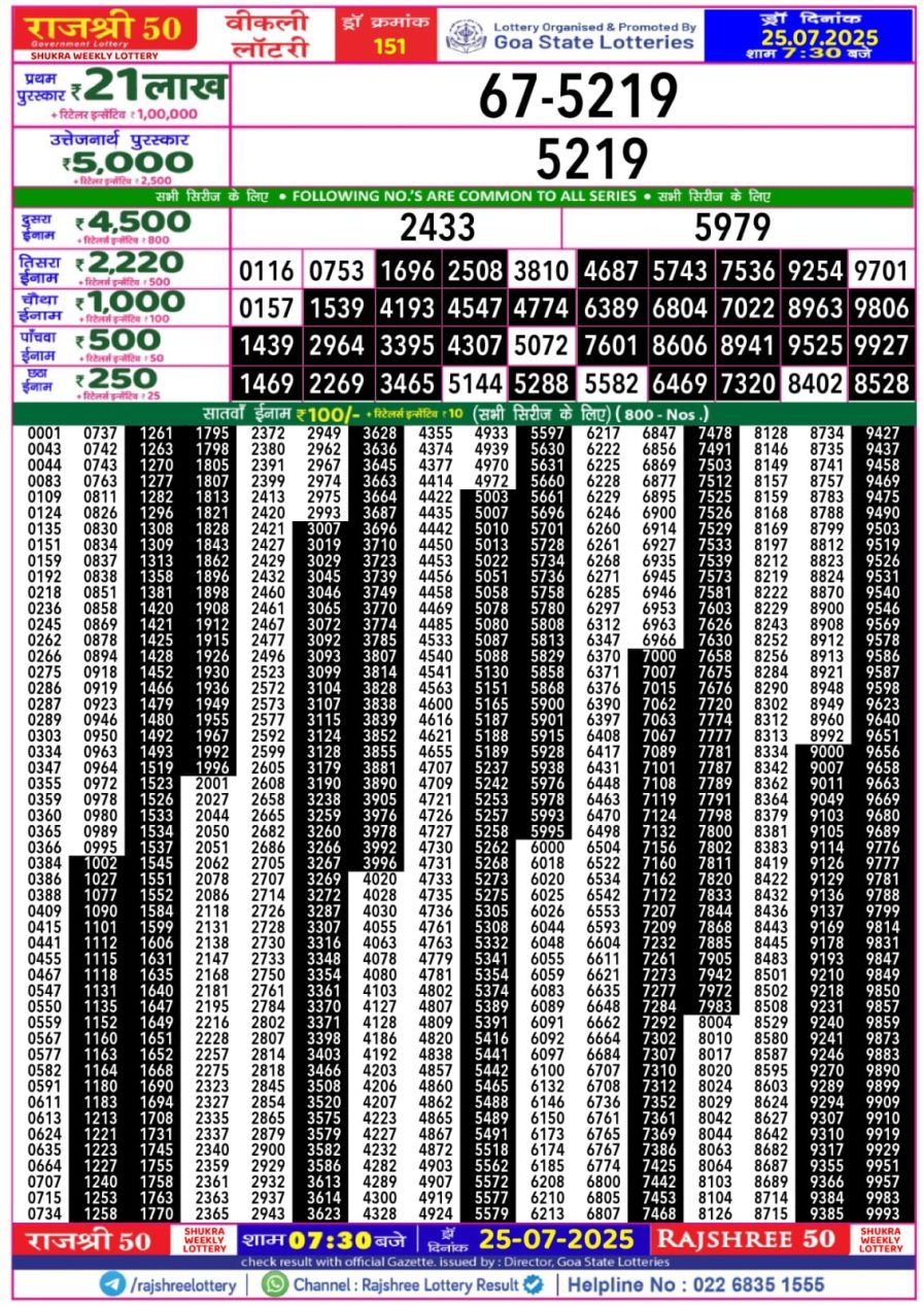 राजश्री 50 लाटरी का रात 7:30 बजे का रिज़ल्ट दिनांक 25.7.25