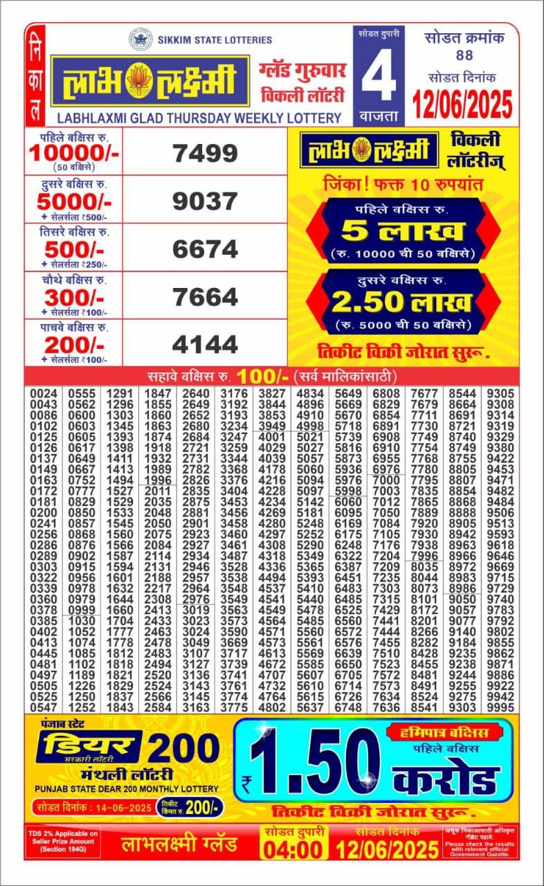 लाभ लक्ष्मी लाटरी 4 बजे दिनांक 12.6.25 का रिज़ल्ट