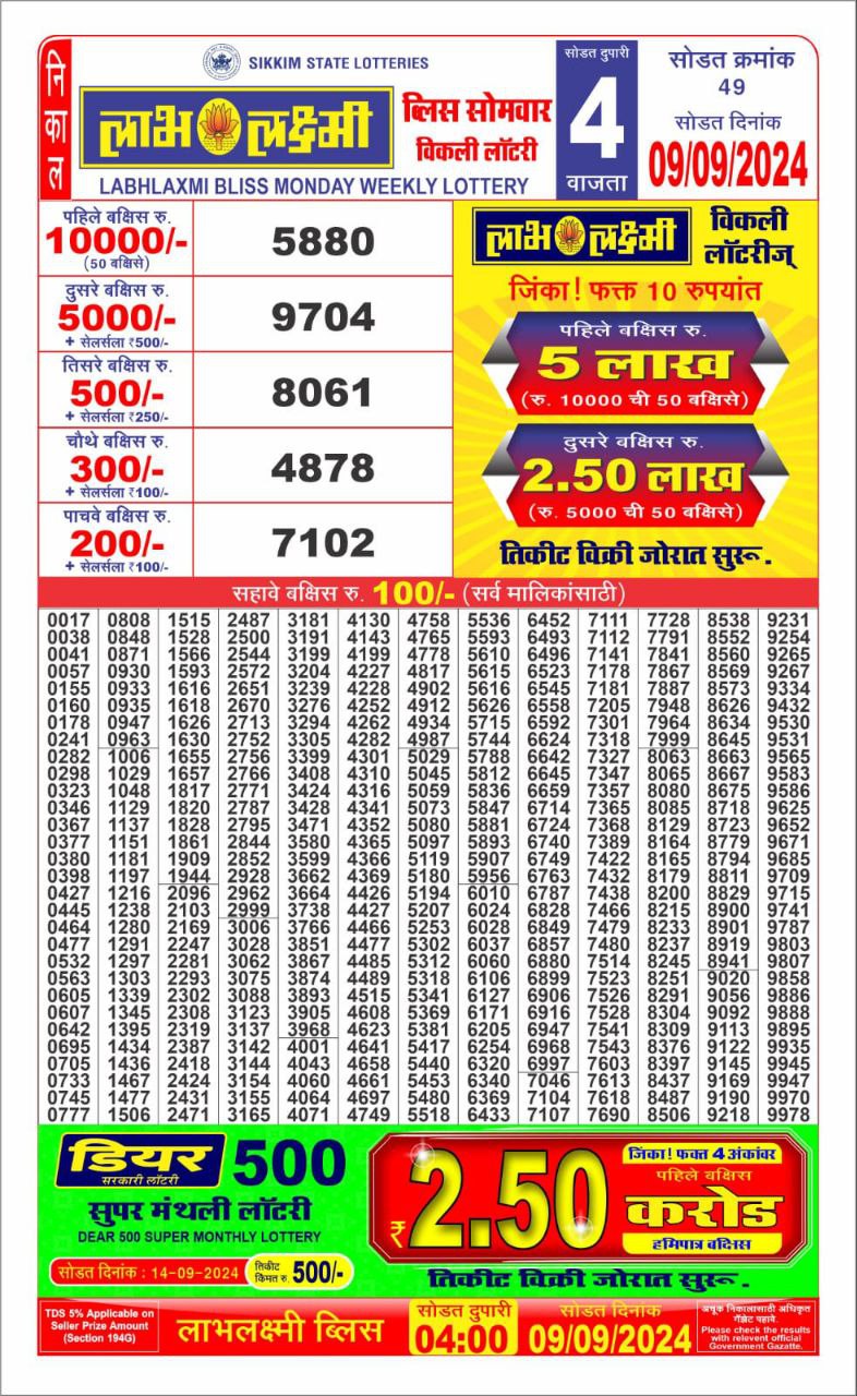 लाभ लक्ष्मी लाटरी 4 बजे दिनांक 30.10.25 का रिजल्ट