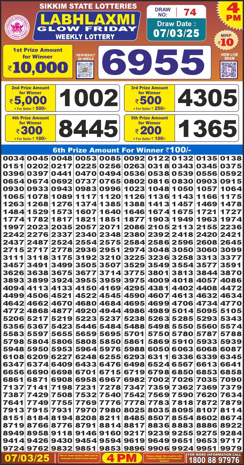 Nagaland State Lotteries was established in the year 1972 under the supervision of the Finance Department to generate a dependable source of revenue for the State Government. Nagaland State Lottery is held every day of the week at three different times of the day, Morning, Day, and Evening. Every day, the lottery is held under a different name with some difference in the prize money with the top prize worth ₹1 Crore (including Super Prize amount). The daily lotteries hosted by Nagaland State include Dear Morning Lottery, Dear Day Lottery, and Dear Evening Lottery which costs 6 Rupees for each ticket.