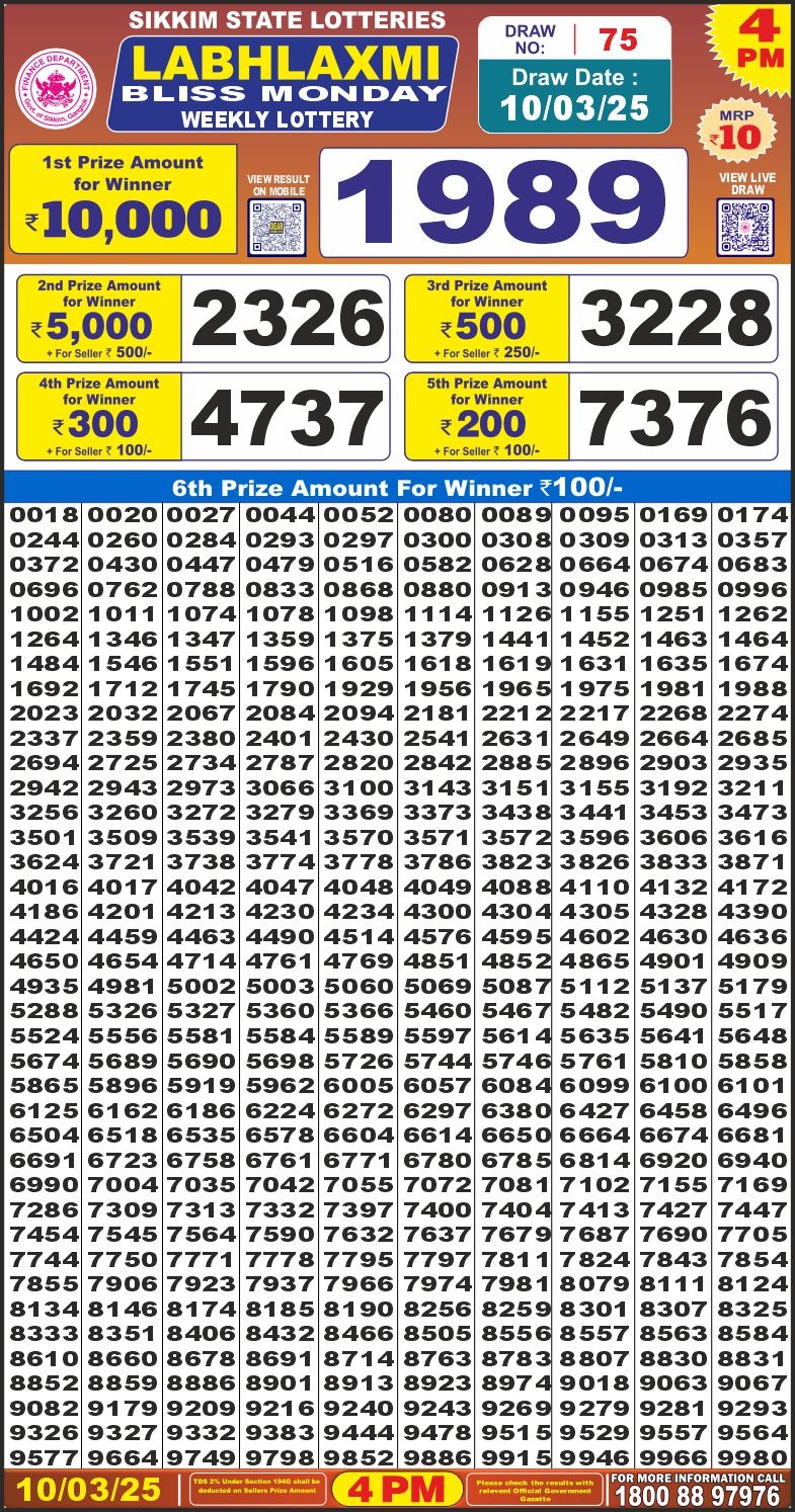 Nagaland State Lotteries was established in the year 1972 under the supervision of the Finance Department to generate a dependable source of revenue for the State Government. Nagaland State Lottery is held every day of the week at three different times of the day, Morning, Day, and Evening. Every day, the lottery is held under a different name with some difference in the prize money with the top prize worth ₹1 Crore (including Super Prize amount). The daily lotteries hosted by Nagaland State include Dear Morning Lottery, Dear Day Lottery, and Dear Evening Lottery which costs 6 Rupees for each ticket.
