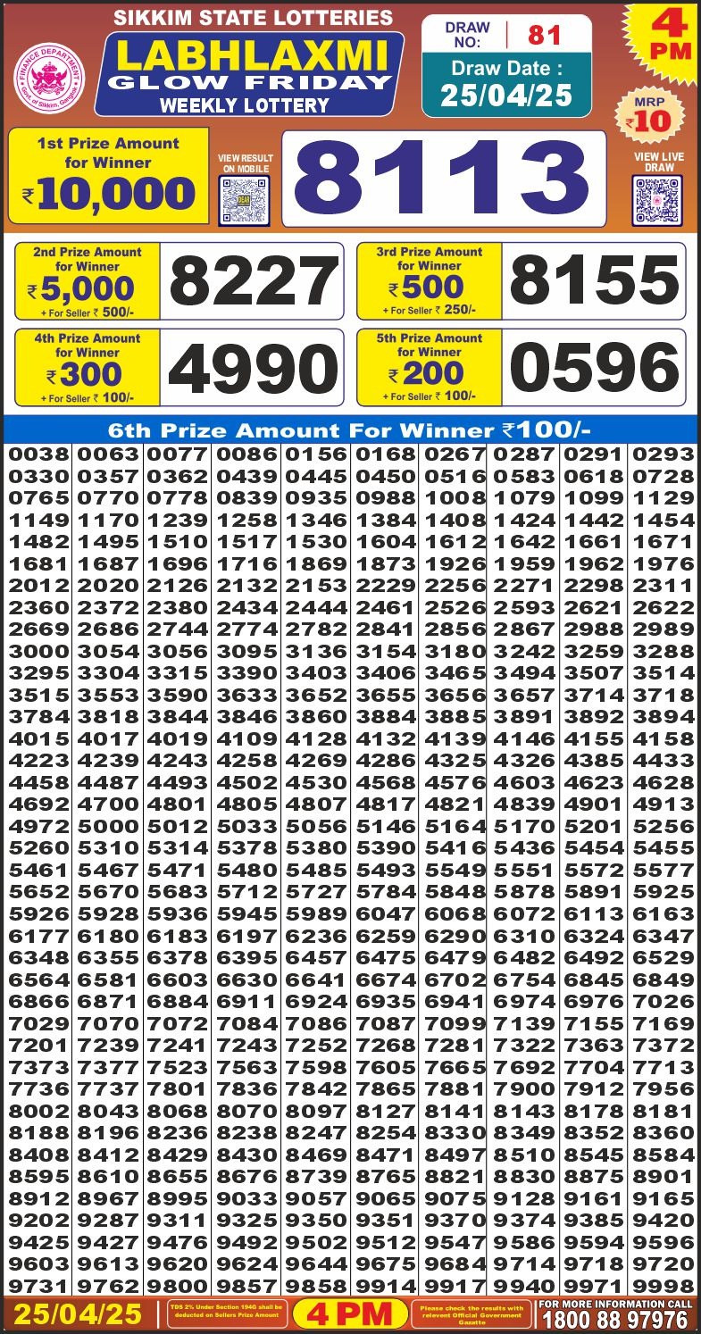 लाभ लक्ष्मी लाटरी 4 बजे दिनांक 20.9.25 का रिज़ल्ट