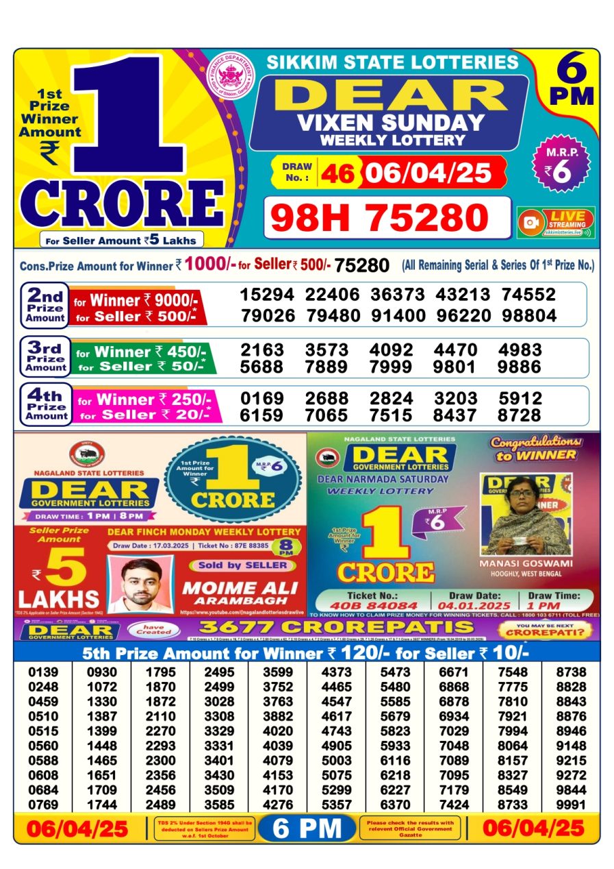 Nagaland State Lotteries was established in the year 1972 under the supervision of the Finance Department to generate a dependable source of revenue for the State Government. Nagaland State Lottery is held every day of the week at three different times of the day, Morning, Day, and Evening. Every day, the lottery is held under a different name with some difference in the prize money with the top prize worth ₹1 Crore (including Super Prize amount). The daily lotteries hosted by Nagaland State include Dear Morning Lottery, Dear Day Lottery, and Dear Evening Lottery which costs 6 Rupees for each ticket.
