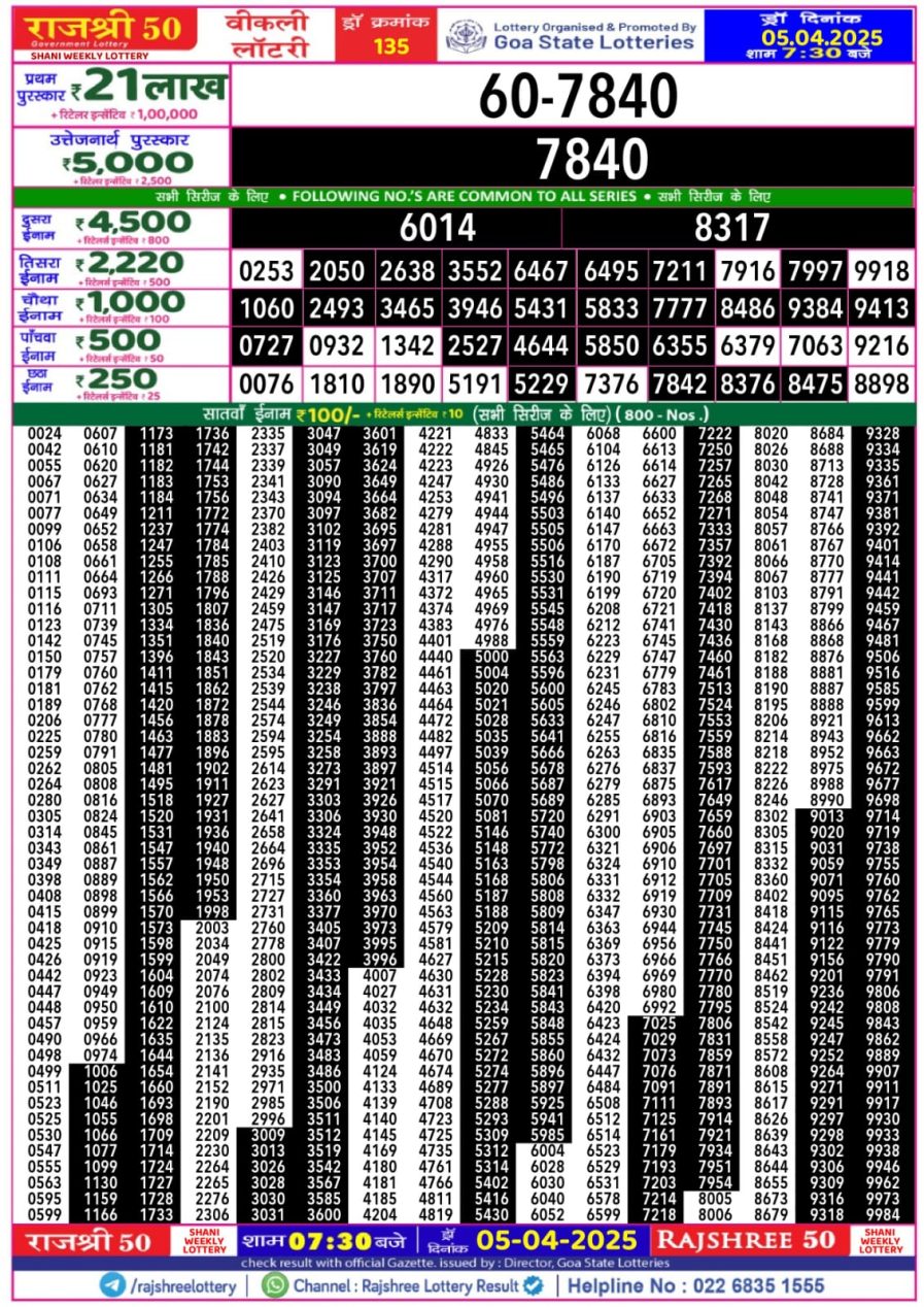 राजश्री 50 लाटरी का रात 7:30 बजे का रिज़ल्ट दिनांक 21.11.25