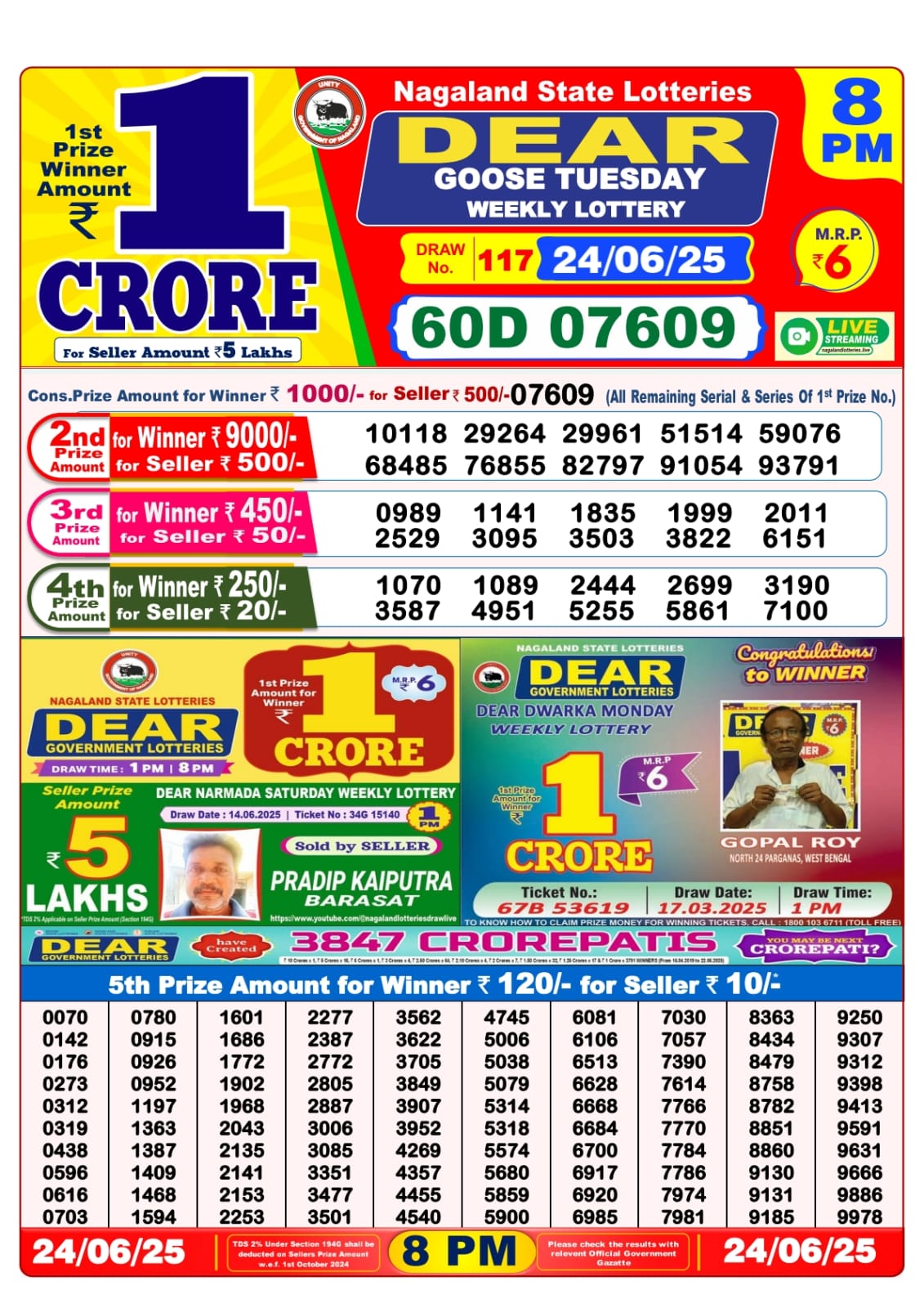 डिअर लाटरी का रात 8 बजे का रिज़ल्ट दिनांक 24.11.25