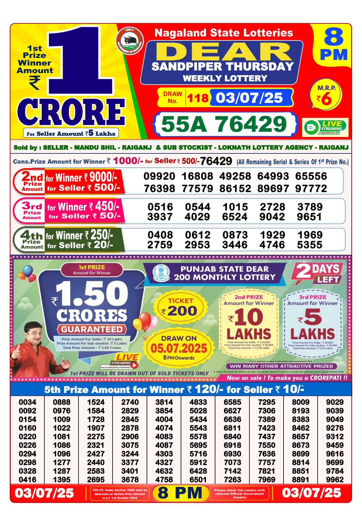 डिअर लाटरी का रात 8 बजे का रिज़ल्ट दिनांक 03.12.25