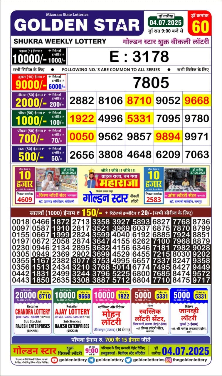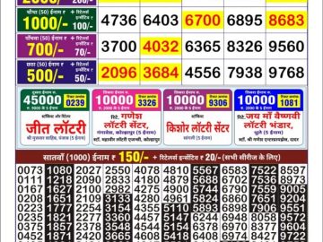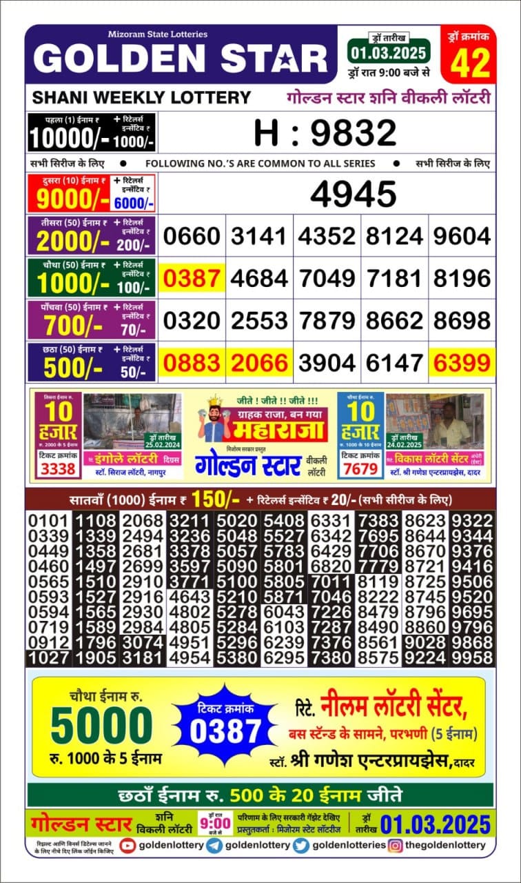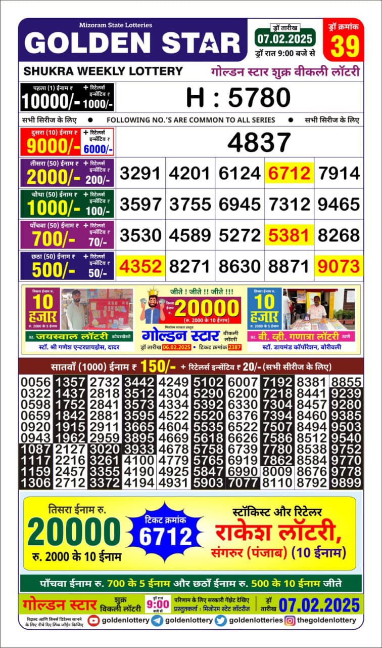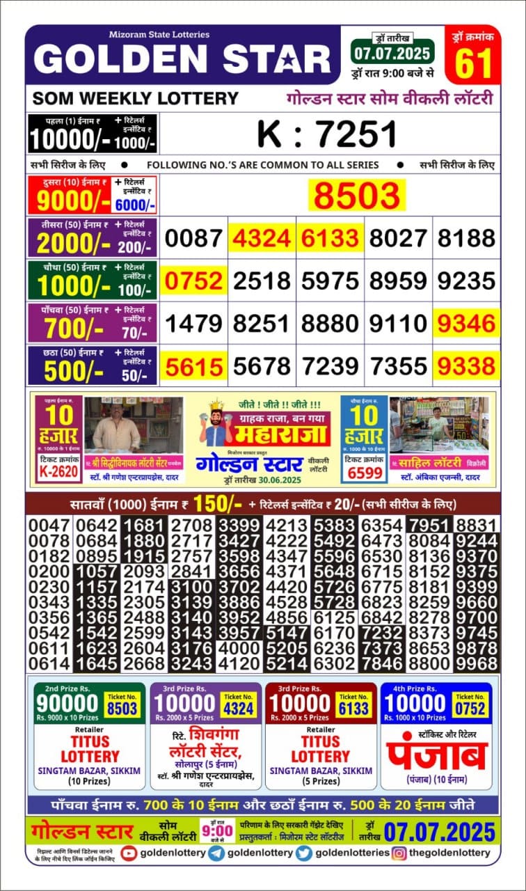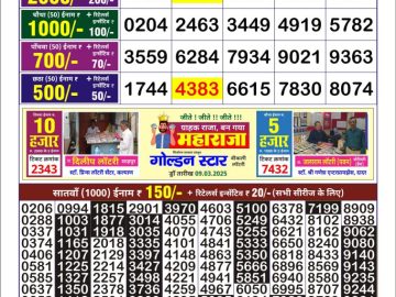 गोल्डन लाटरी का रात 9 बजे का रिज़ल्ट दिनांक 07.12.25