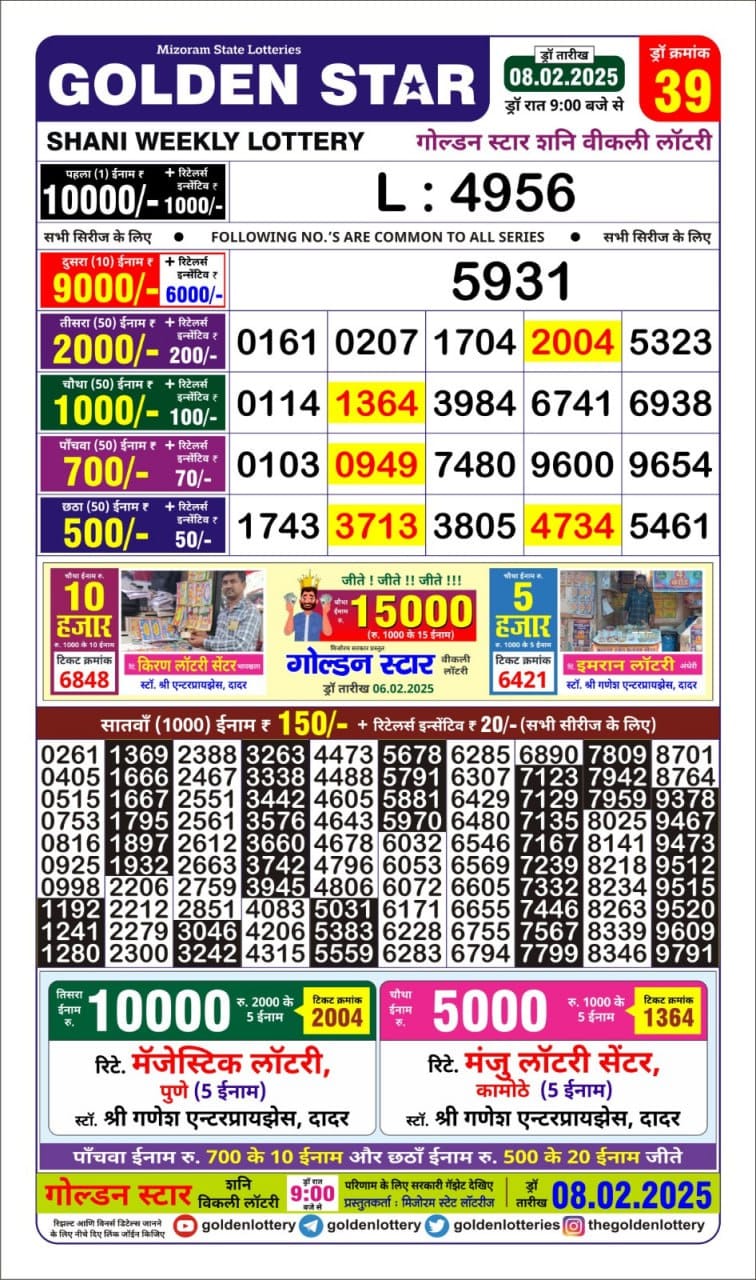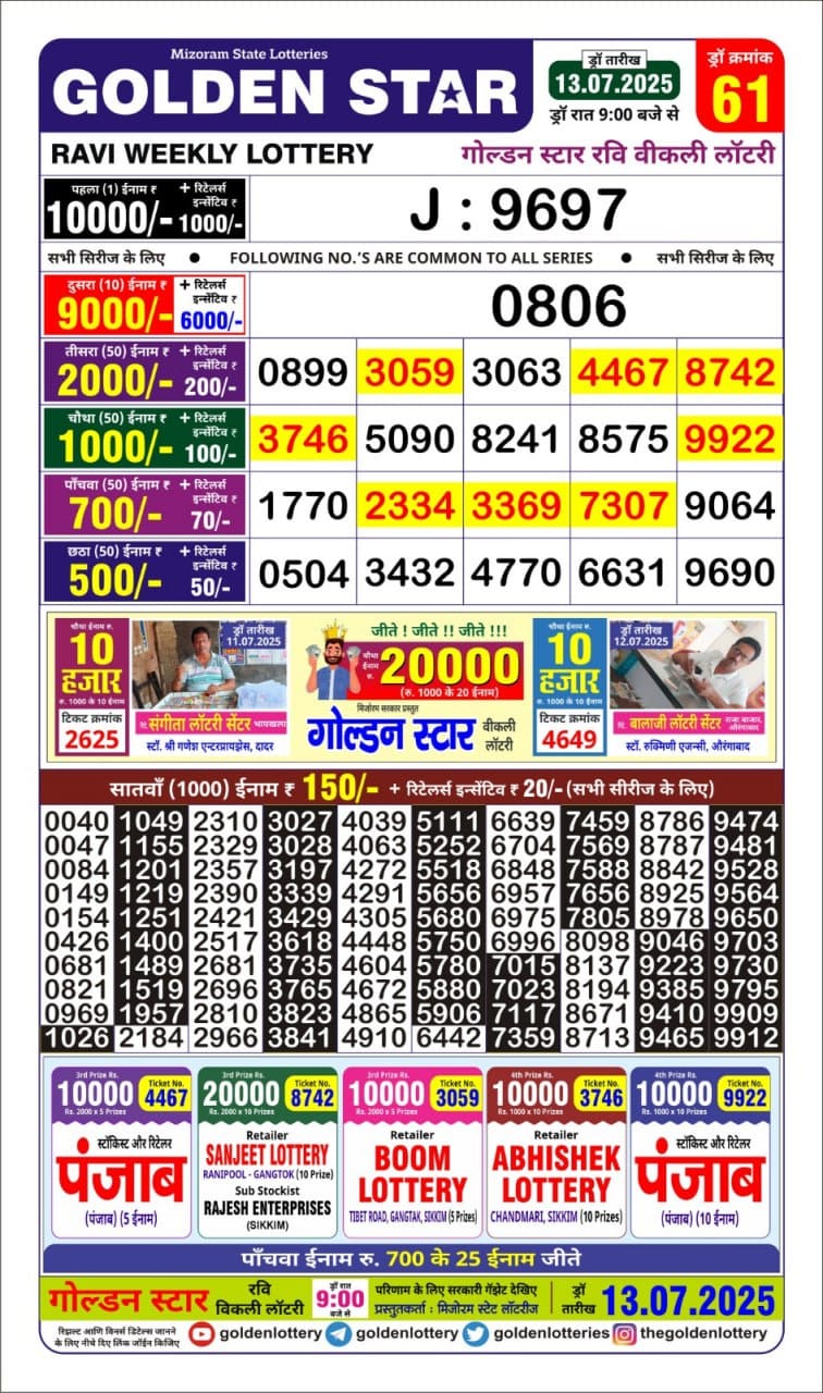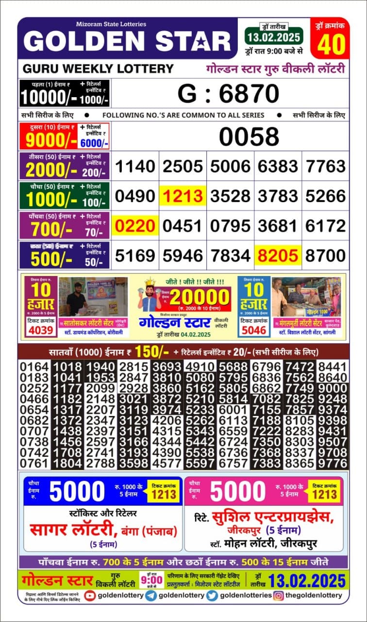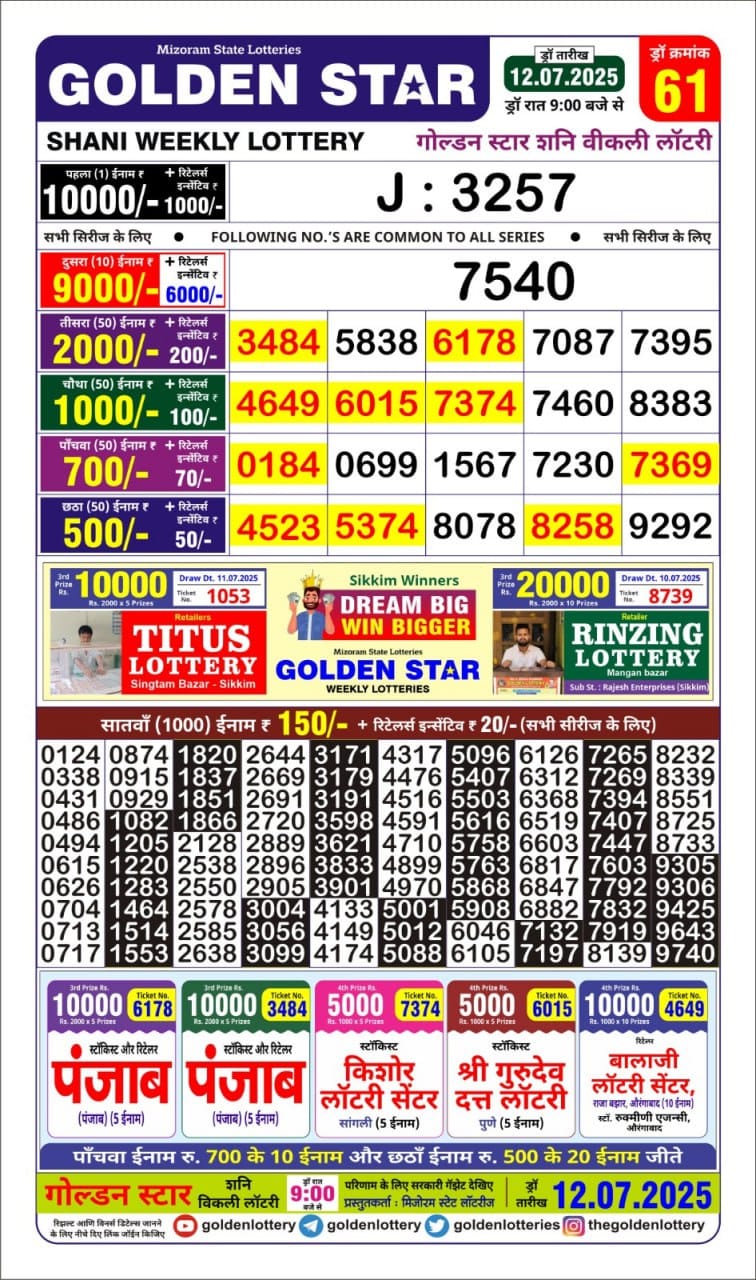 गोल्डन लाटरी का रात 9 बजे का रिज़ल्ट दिनांक 13.12.25