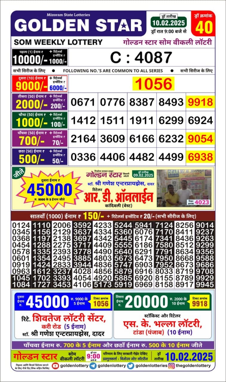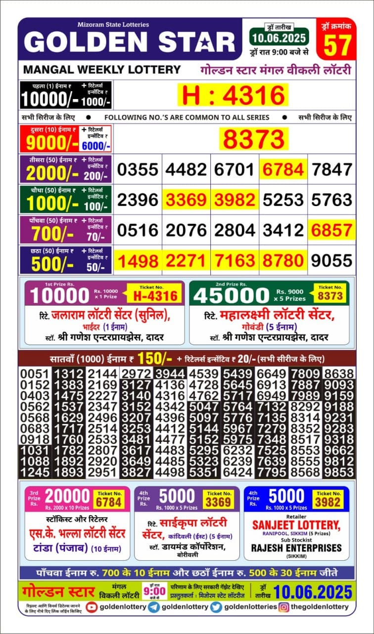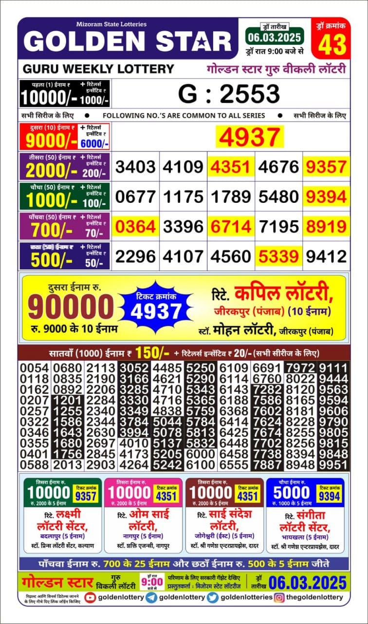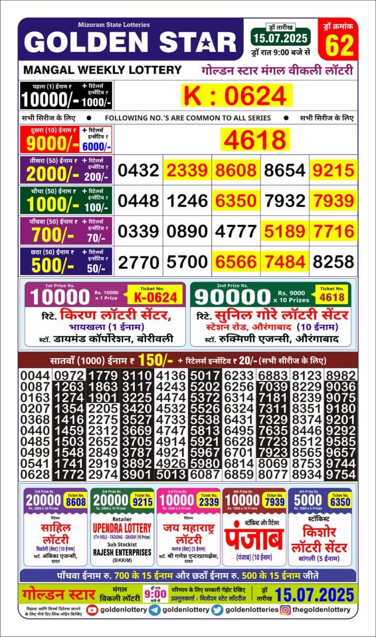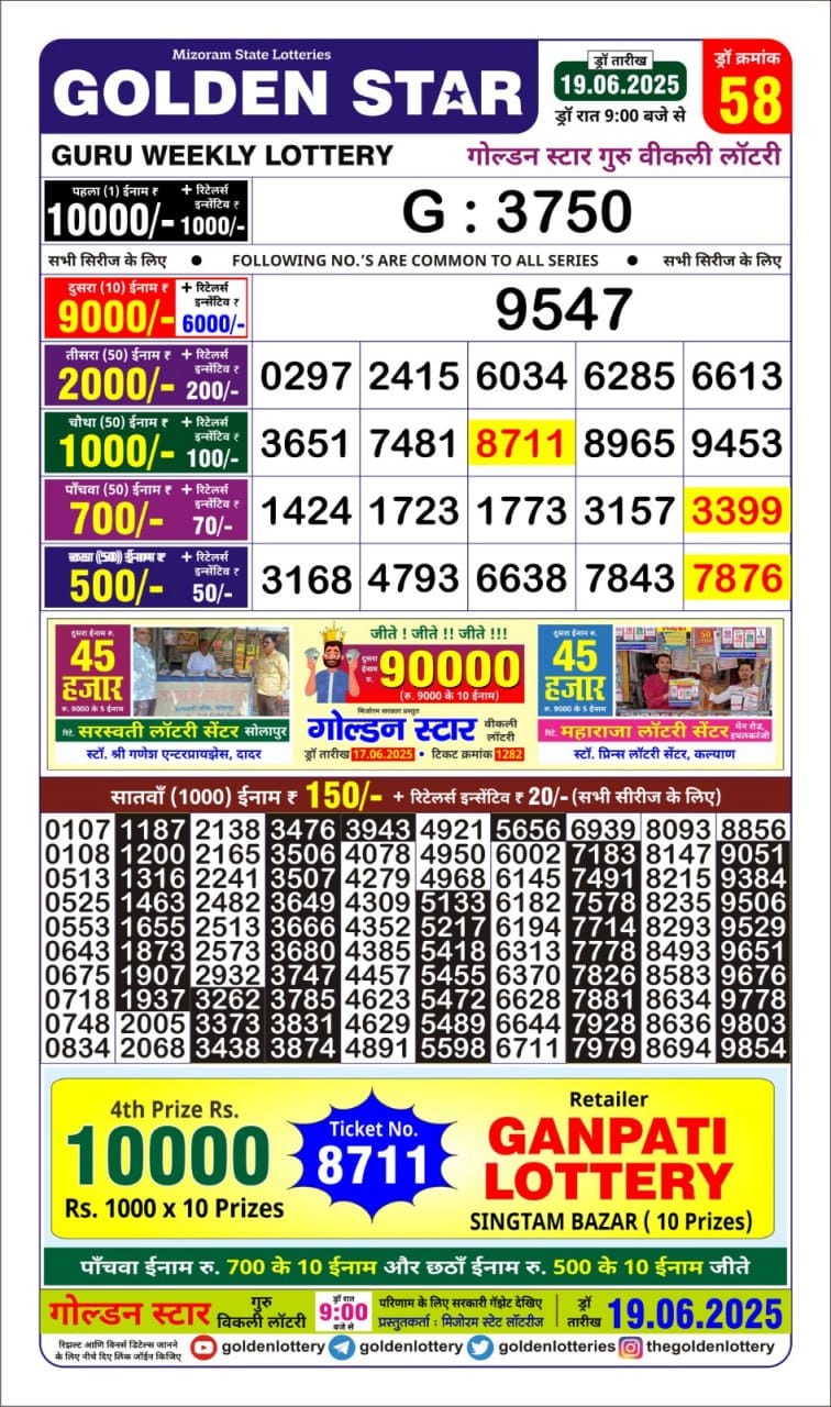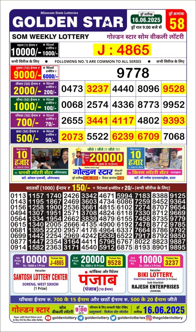 गोल्डन लाटरी का रात 9 बजे का रिज़ल्ट दिनांक 16.10.25