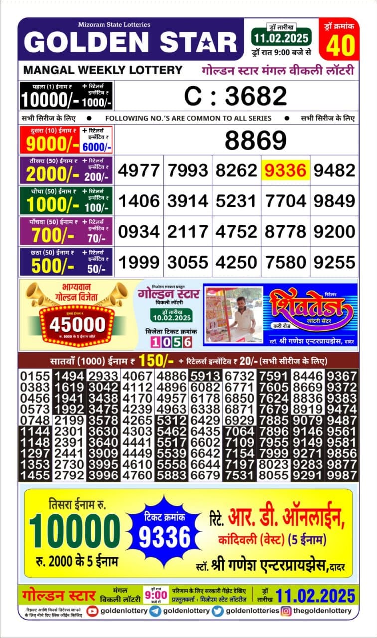 गोल्डन लाटरी का रात 9 बजे का रिज़ल्ट दिनांक 10.11.25