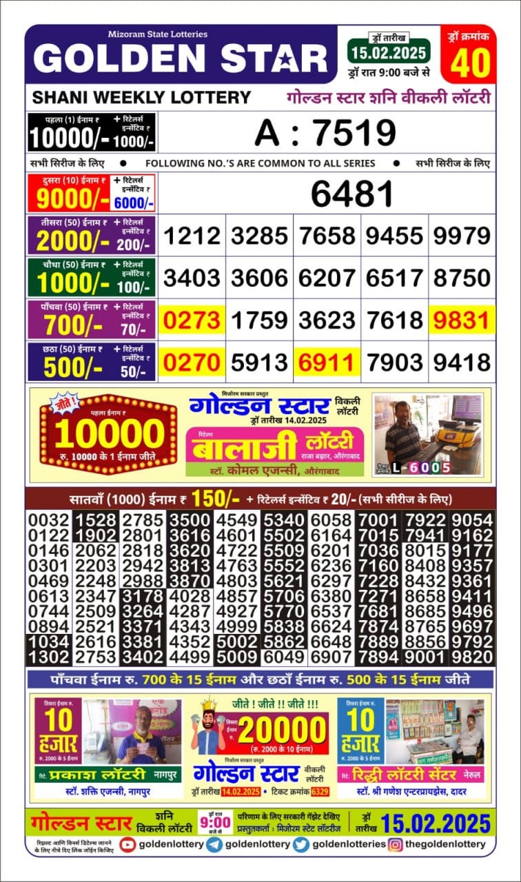 गोल्डन लाटरी का रात 9 बजे का रिज़ल्ट दिनांक 15.11.25