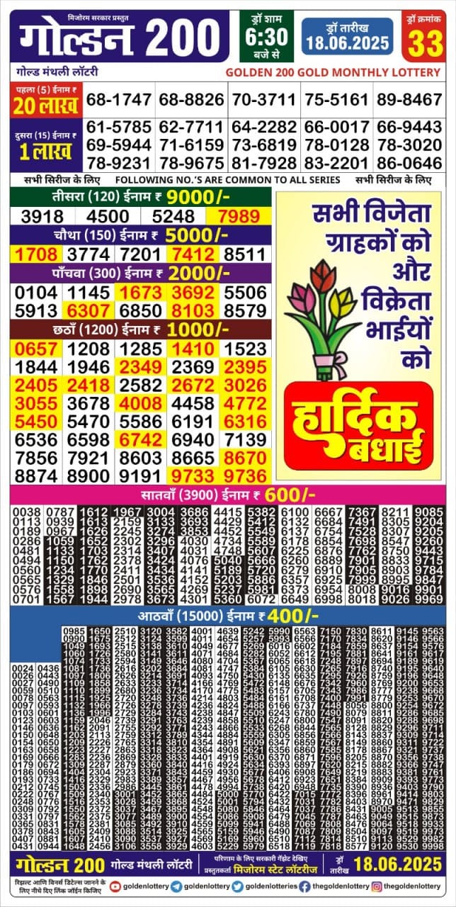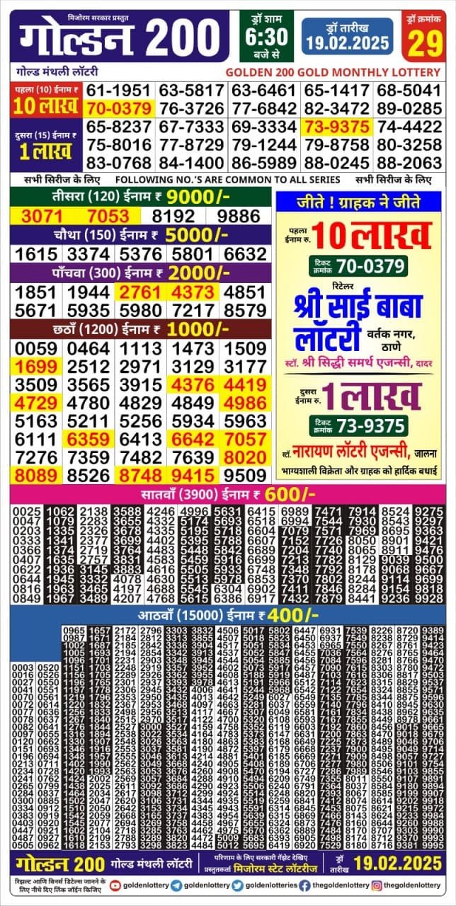 गोल्डन 200 मंथली लॉटरी रिजल्ट 15.10.25
