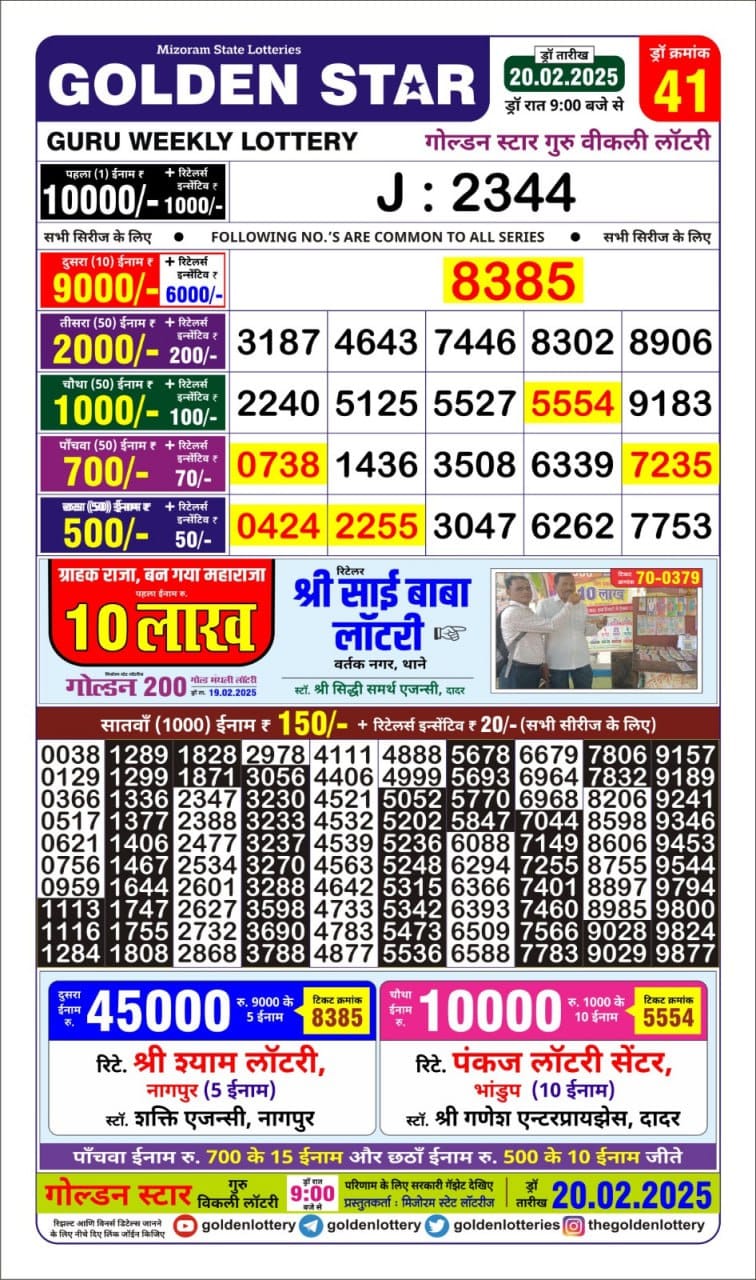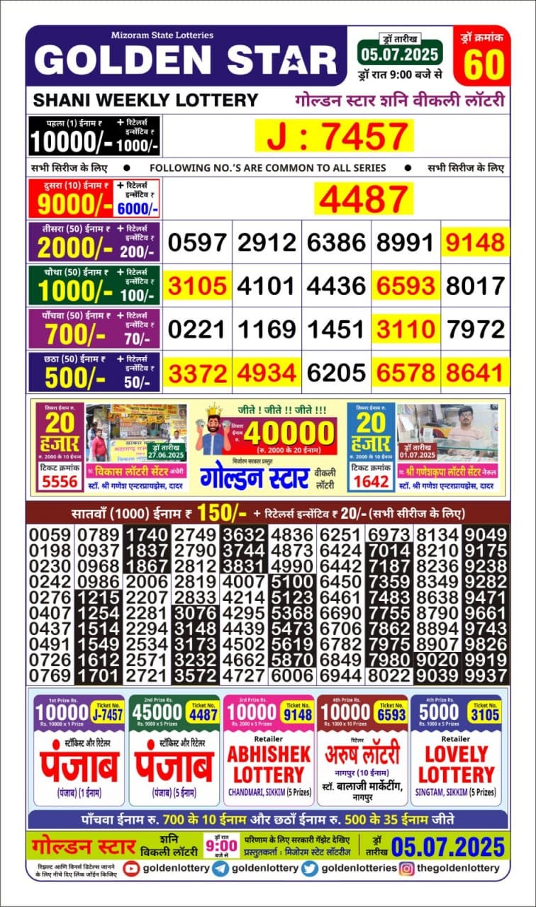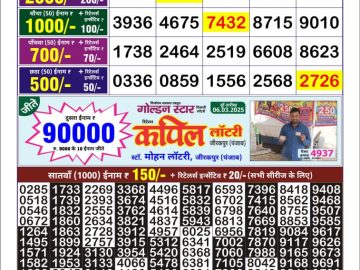 गोल्डन लाटरी का रात 9 बजे का रिज़ल्ट दिनांक 20.11.25