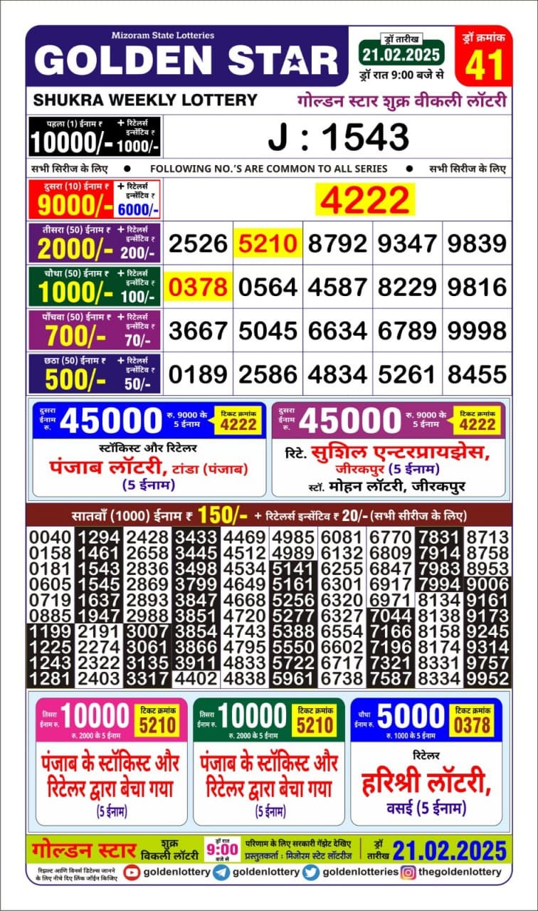 गोल्डन लाटरी का रात 9 बजे का रिज़ल्ट दिनांक 21.11.25