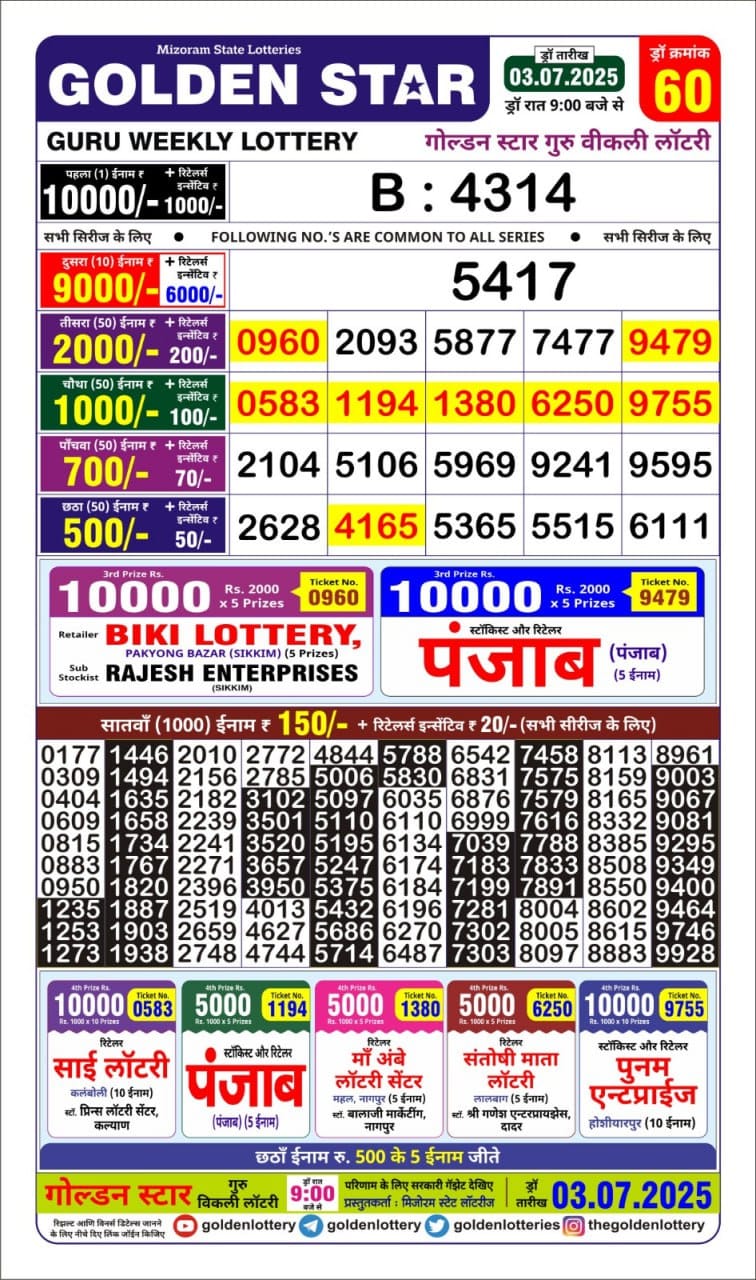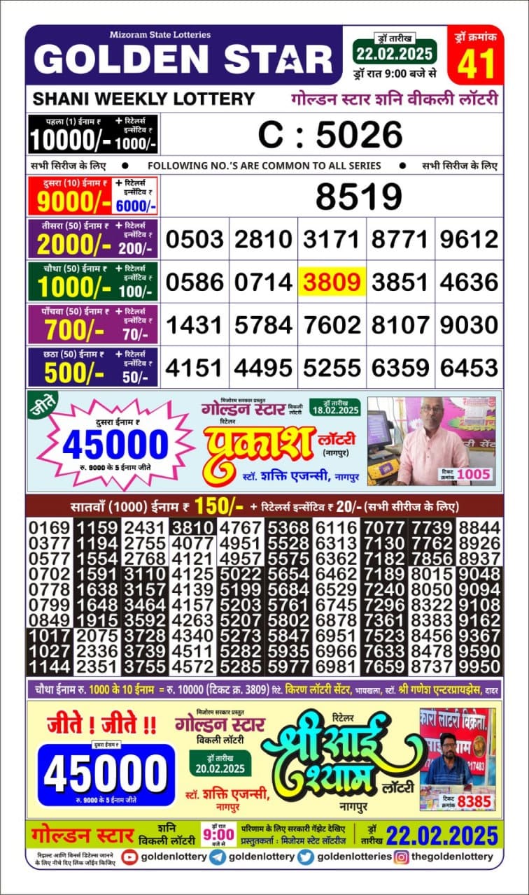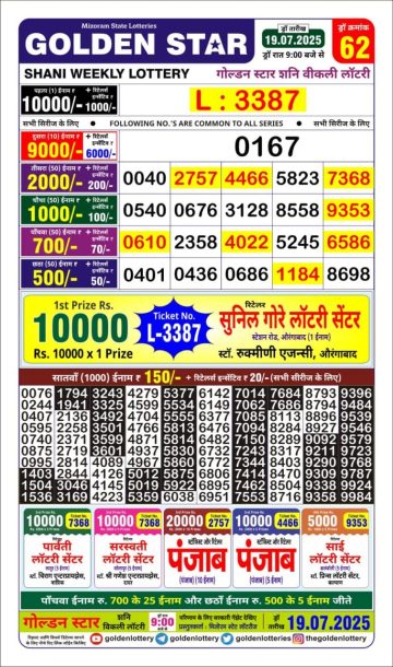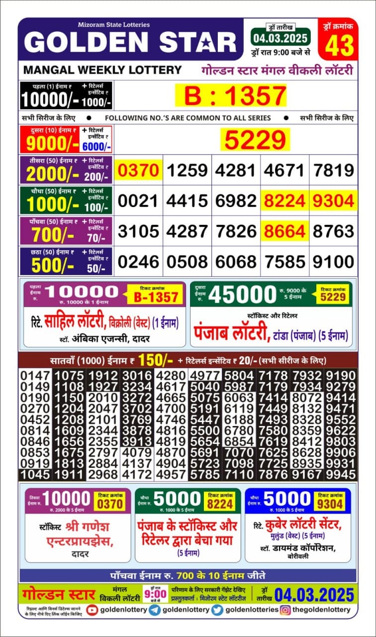 गोल्डन लाटरी का रात 9 बजे का रिज़ल्ट दिनांक 17.10.25