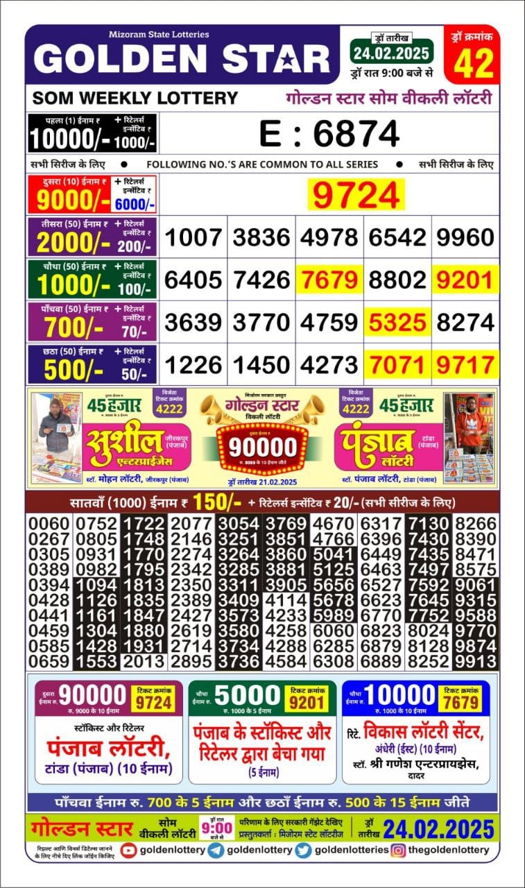 गोल्डन लाटरी का रात 9 बजे का रिज़ल्ट दिनांक 24.11.25