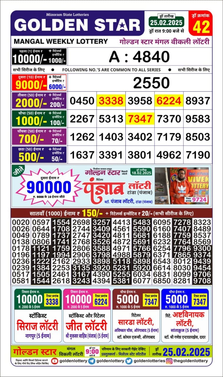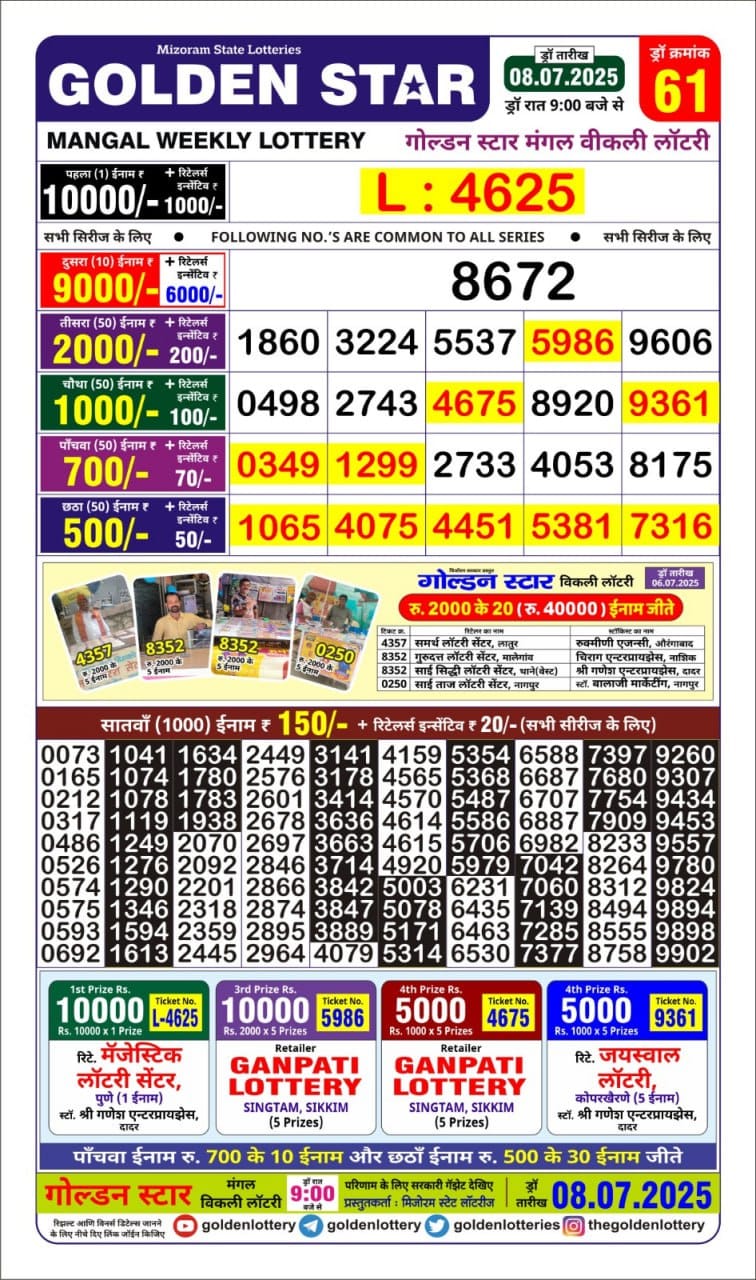 गोल्डन लाटरी का रात 9 बजे का रिज़ल्ट दिनांक 25.11.25