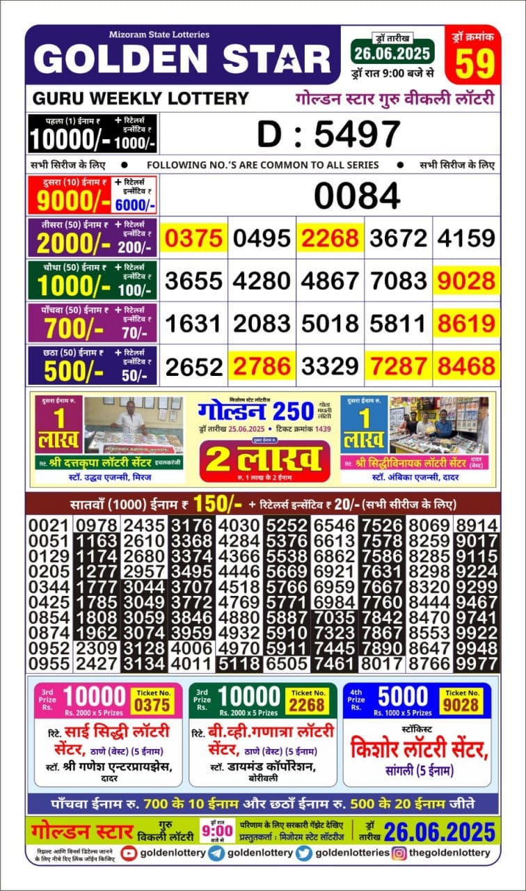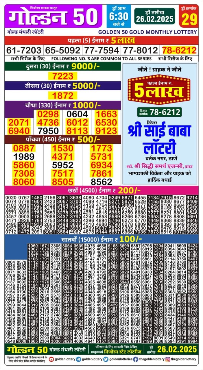 गोल्डन लाटरी का रात 9 बजे का रिज़ल्ट दिनांक 26.10.25