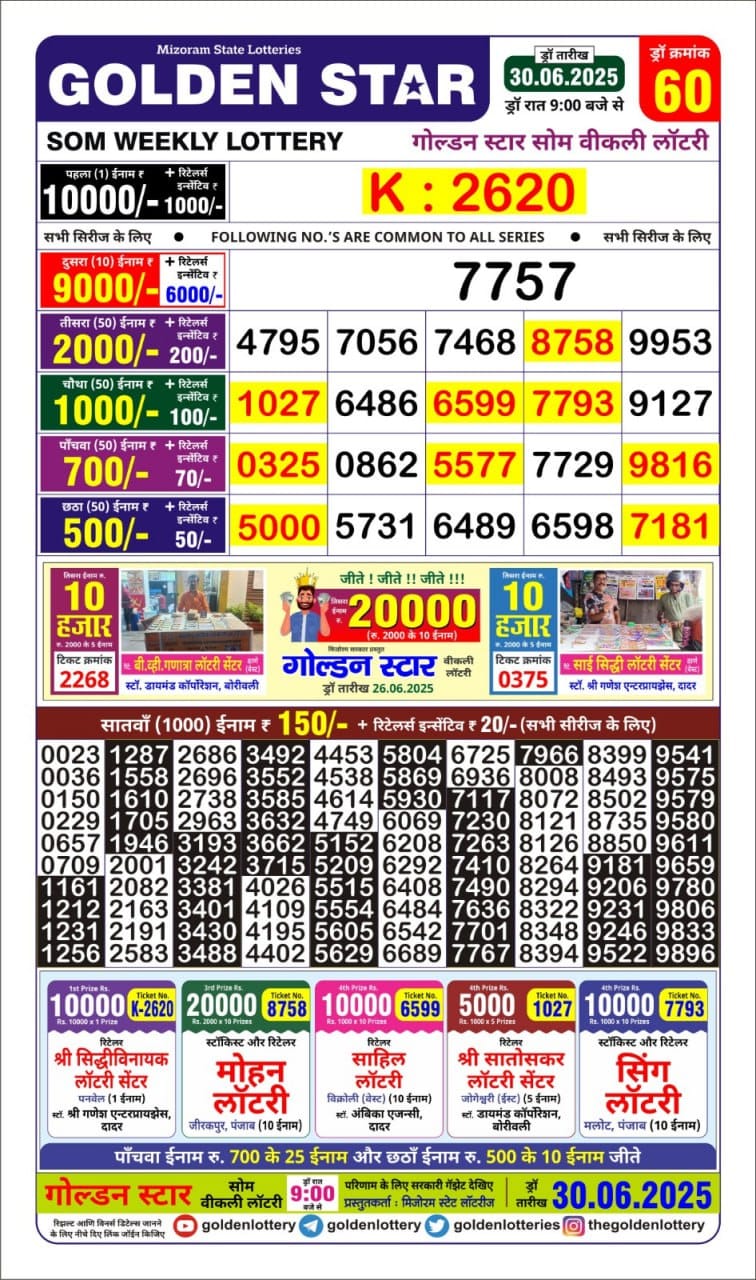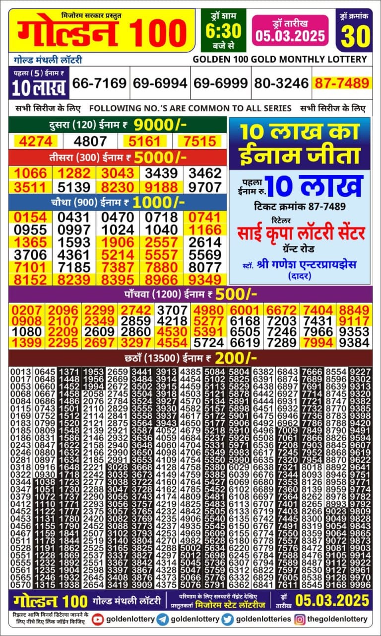 गोल्डन लाटरी का रात 9 बजे का रिज़ल्ट दिनांक 30.10.25